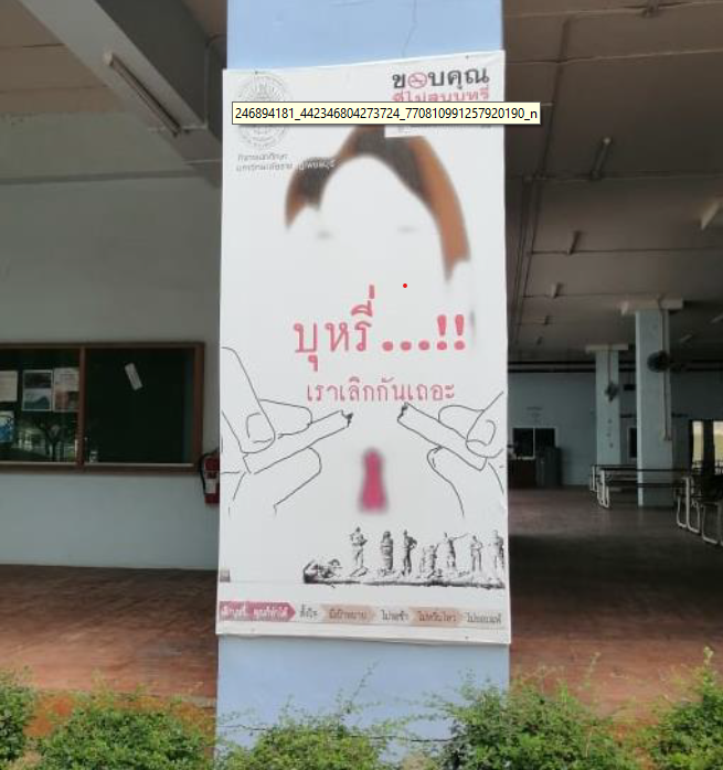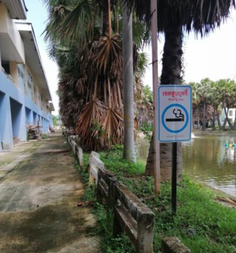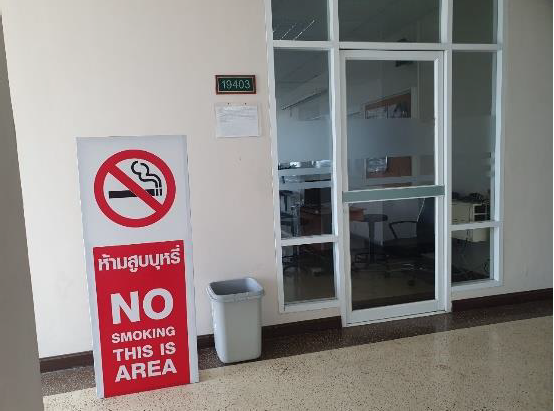ตามนโยบายปลอดบุหรี่ของมหาวิทยาลัยได้กาหนดพื้นที่เขตปลอดบุหรี่ ได้แก่ภายในอาคาร หรือสิ่งปลูกสร้างชองมหาวิทยาลัยเป็นสถานที่สาธารณะที่ให้มีการคุ้มครองสุขภาพของผู้ไม่สูบบุหรี่ และมีการกาหนดเครื่องหมาย “เขตปลอดบุหรี่” รูปแบบตามหลักเกณฑ์หรือมาตรฐานที่กฎหมายกาหนด ติดแสดงในตาแหน่งที่เห็นได้ชัดเจนบริเวณพื้นที่ ปราศจากอุปกรณ์หรือสิ่งอานวยความสะดวกสาหรับการสูบบุหรี่และไม่มีการสูบบุหรี่ แสดงดังรูป