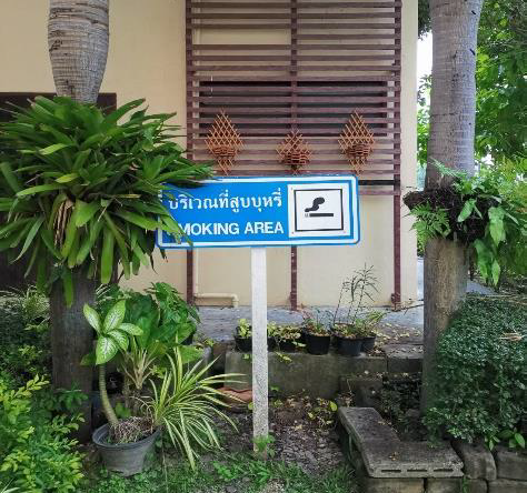 ตามนโยบายมหาวิทยาลัยได้กำหนดพื้นที่ในการสูบบุหรี่ ได้แก่ พื้นที่นอกเหนือจากพื้นที่ภายในอาคารหรือสิ่งปลูกสร้าง สามารถจัดเขตพื้นที่สูบบุหรี่ได้เป็นการเฉพาะโดยต้องจัดให้ถูกต้อง และครอบคลุมตามประกาศกระทรวงสาธารณสุข และมีการกำหนดเครื่องหมาย “เขตสูบบุหรี่” ติดแสดงในตำแหน่งที่เห็นได้ชัดเจนบริเวณพื้นที่ มีพื้นที่เป็นสัดส่วนชัดเจน โดยคำนึงถึงการระบายอาการที่เหมาะสม และไม่มีลักษณะที่ก่อให้เกิดความเดือดร้อนราคาญแก่ผู้อื่น แสดงดังรูป