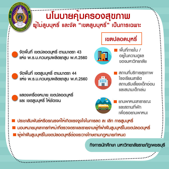มหาวิทยาลัยมีการประกาศนโยบายคุ้มครองสุขภาพผู้ไม่สูบบุหรี่และจัด “เขตสูบบุหรี่” เป็นการเฉพาะ พ.ศ. 2562 ตามประกาศกระทรวงสาธารณสุข (ฉบับที่ 19) พ.ศ. 2553 เรื่องกำหนดพื้นที่ในการสูบบุหรี่ตามประกาศกระทรวงสาธารณสุข (ฉบับที่ 19) พ.ศ.2553 เรื่องกำหนดชื่อหรือประเภทของสถานที่สาธารณะที่ให้มีการคุ้มครองสุขภาพของผู้ไม่สูบบุหรี่ กำหนดให้มหาวิทยาลัยเป็นสถานที่ให้มีการคุ้มครองสุขภาพผู้ไม่สูบบุหรี่ และตามพระราชบัญญัติควบคุมผลิตภัณฑ์ยาสูบ พ.ศ. 2560 หมวด 6 การคุ้มครองสุขภาพของผู้ไม่สูบบุหรี่ ด้วยเหตุนี้มหาวิทยาลัยจึงได้ออกประกาศนโยบายด้านการป้องกันผู้ไม่สูบบุหรี่ และกำหนดพื้นที่ในการสูบบุหรี่ โดยภายในอาคารหรือสิ่งปลูกสร้างของมหาวิทยาลัยเป็นสถานที่สาธารณะที่ให้มีการคุ้มครองสุขภาพของผู้ไม่สูบบุหรี่ กำหนดเป็นเขตปลอดบุหรี่ทั้งหมด และสถานที่นอกเหนือจากพื้นที่ภายในอาคารหรือสิ่งปลูกสร้าง สามารถจัดเขตพื้นที่สูบบุหรี่ได้เป็นการเฉพาะโดยต้องจัดให้ถูกต้อง และครอบคลุมตามประกาศกระทรวงสาธารณสุข ซึ่งมหาวิทยาลัยได้นานโยบายประกาศให้บุคลากร นักศึกษา และเผยแพร่ลงบนเว็บไซต์กองพัฒนานักศึกษา สำนักงานอธิการบดี ให้ถือปฏิบัติต่อไปมาตั้งแต่ปี พ.ศ.2562 จนถึงปัจจุบัน