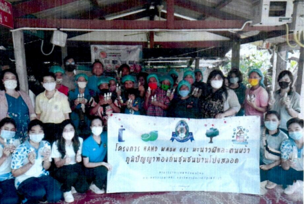 นักศึกษาสอนสาธิตการทำ Hand Wash Gel มะนาวผีและต้นหว้า ให้กับคนในชุมชนโค้งตาบาง