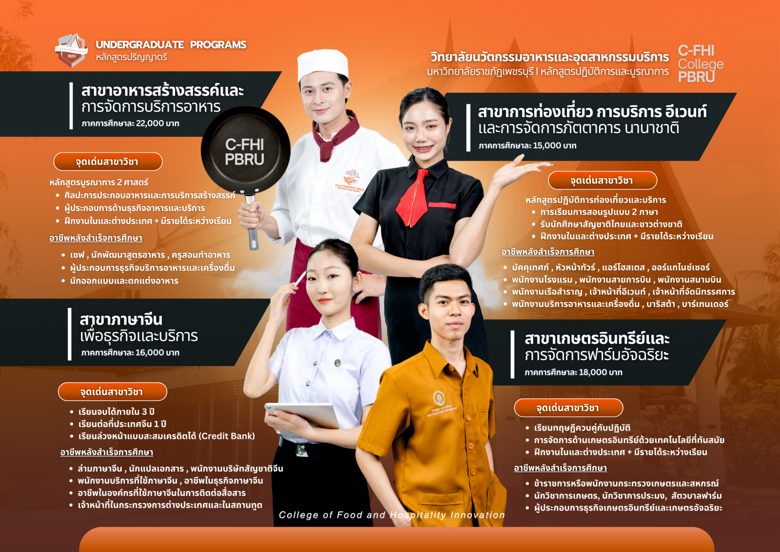 วิทยาลัยนวัตกรรมอาหารและอุตสาหกรรมบริการ วิทยาลัยนวัตกรรมอาหารและอุตสาหกรรมบริการ College of Food and Hospitality Innovation เข้าสู่เว็บไซต์ เกี่ยวกับคณะ หลักสูตร ติดต่อ Menu เกี่ยวกับคณะ หลักสูตร ติดต่อ รู้จักคณะ ปรัชญา Philosophy : – ผู้นำทางสู่การเปลี่ยนแปลงนวัตกรรมการบริการ และความรุดหน้าเชิงนวัตกรรมเพื่อการยกระดับบัณฑิตสู่ความเป็นเลิศด้านวิชาชีพ วิสัยทัศน์ Vision: – ภายในปี 2567-2571 วิทยาลัยนวัตกรรมอาหารและอุตสาหกรรมบริการ จะเป็นศูนย์กลางแห่งนวัตกรรมด้านอาหาร และอุตสาหกรรมบริการที่สร้าง ความเป็นเลิศในระดับสากล พันธกิจ Obilgation: – 1. ผลิตบัณฑิตด้านอาหาร การท่องเที่ยว การบริการ และการเกษตรมูลค่าสูงที่เน้นการเรียนรู้เชิงปฏิบัติการ เพื่อรองรับอุตสาหกรรมใหม่ S – Curve และ NEW S – Curve2. สนับสนุนการบริการวิชาการ การจัดการอบรมหลักสูตรระยะสั้น ให้แก่ บัณฑิต บุคลากรภายในมหาวิทยาลัย บุคคลทั่วไป หรือผู้ที่สนใจที่จะพัฒนาต่อยอดทักษะและเรียนรู้ทักษะใหม่ ส่งเสริมการวิจัยและพัฒนาด้านอาหาร การท่องเที่ยว การบริการ และการเกษตรมูลค่าสูง โดยเน้นการสร้างนวัตกรรมและเทคโนโลยี3. แสวงหารายได้และจัดหาผลประโยชน์ให้กับมหาวิทยาลัย4. การสร้างเครือข่ายความร่วมมือด้านอาหาร การท่องเที่ยว การบริการ และการเกษตรมูลค่าสูงระดับประเทศและนานาชาติ เอกลักษณ์ Identities : – นักเดินทาง ผู้ให้บริการ เกษตรอัจฉริยะ ต้นเครื่องแห่งเมืองพริบพรี อัตลักษณ์ Identities Identities : – ทักษะฝีมือ ภาษาต่างประเทศ การผสมผสานไทย – สากล ด้วยการบริการที่เป็นเลิศ หลักสูตรที่เปิดสอน หลักสูตรปริญญาตรี ที่รับผิดชอบศิลปศาสตร์บัณฑิต (ศศ. บ.) 3 สาขาวิชา ได้แก่1. การท่องเที่ยว การบริการ อีเวนท์ และการจัดการภัตตาคาร นานาชาติ2. อาหารสร้างสรรค์และการจัดการบริการอาหาร3. ภาษาจีนเพื่อธุรกิจและบริการวิทยาศาสตรบัณฑิต (วท.บ.) 1 สาขาวิชา ได้แก่1. เกษตรอินทรีย์และการจัดการฟาร์มอัจฉริยะ ติดต่อวิทยาลัยนวัตกรรมอาหารและอุตสาหกรรมบริการ วิทยาลัยนวัตกรรมอาหารและอุตสาหกรรมบริการ มหาวิทยาลัยราชภัฏเพชรบุรี38 หมู่ 8 ถ.หาดเจ้าสำราญ ต.นาวุ้งอ.เมือง จ.เพชรบุรี 76000 โทรศัพท์ –email : –เว็บไซต์ –