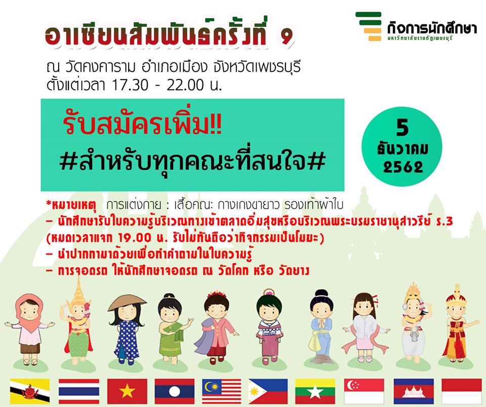 รับเพิ่มสำหรับนักศึกษาทุกคณะที่สนใจเข้าร่วม กิจกรรมอาเซียนสัมพันธ์ครั้งที่ 9 ในวันที่ 5 ธันวาคม 2562 เวลา17.30 น