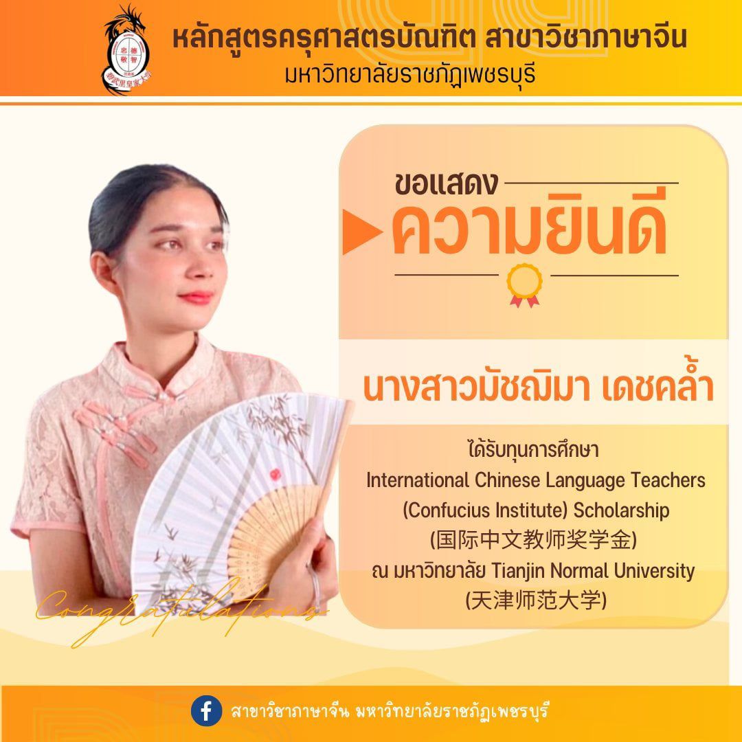 ขอแสดงความยินดีกับนางสาวมัชฌิมา เดชคล้ำ นักศึกษาสาขาวิชาภาษาจีน คณะมนุษยศาสตร์แและสังคมศาสตร์