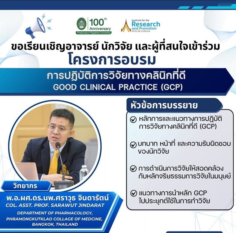 ขอเชิญชวนอาจารย์และนักวิจัยเข้าร่วมโครงการอบรมการปฏิบัติการวิจัยทางคลินิกที่ดี (Good Clinical Practice : GCP) ประจำปี 2569
