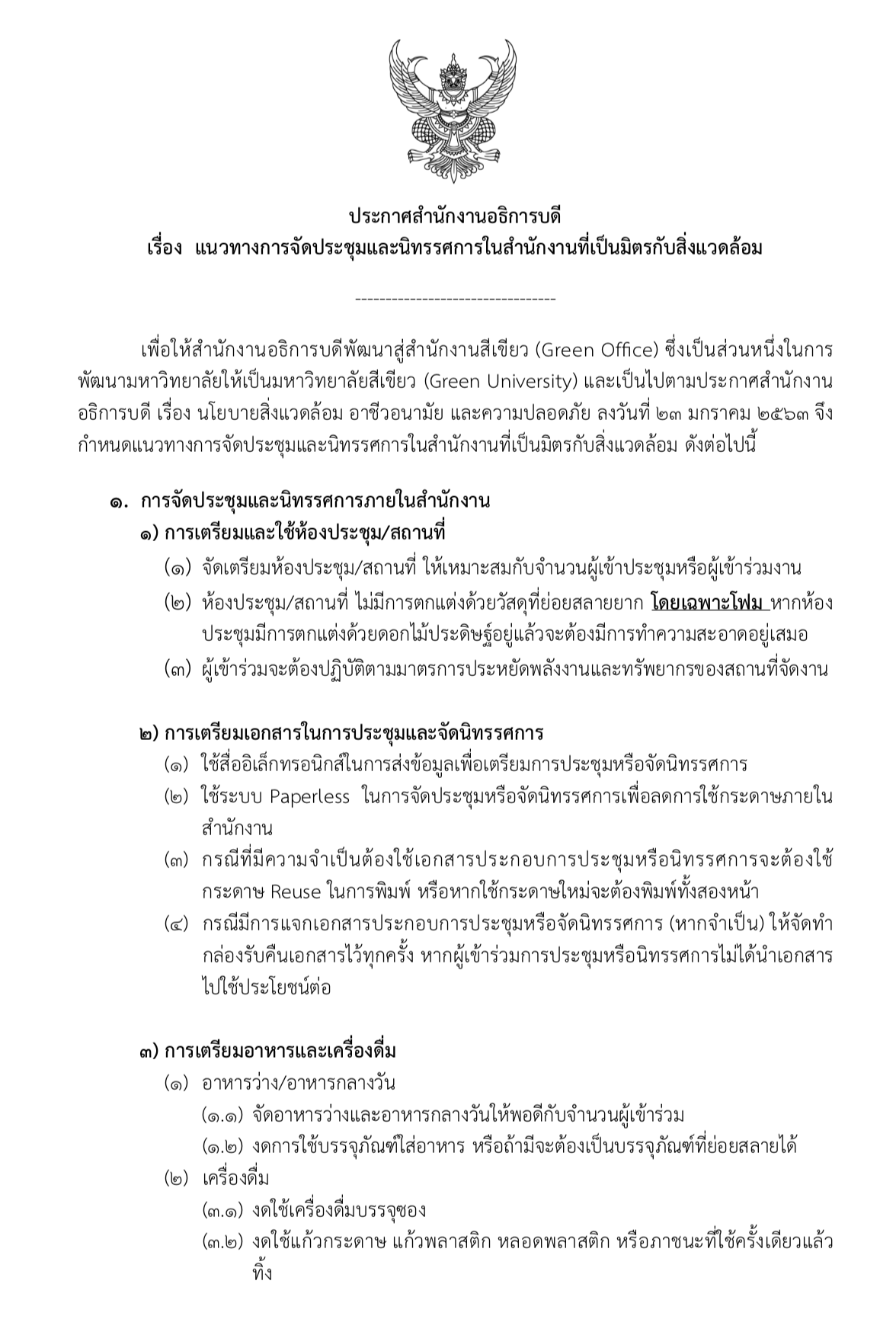 ประกาศสำนักงานอธิการบดี เรื่องแนวทางการจัดประชุมและนิทรรศการในสำนักงานที่เป็นมิตรกับสิ่งแวดล้อม