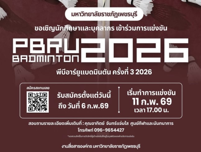 มหาวิทยาลัยราชภัฏเพชรบุรี เชิญชวนนักศึกษาและบุคลากร ร่วมแข่งขัน “PBRU BADMINTON 2026” ครั้งที่ 3