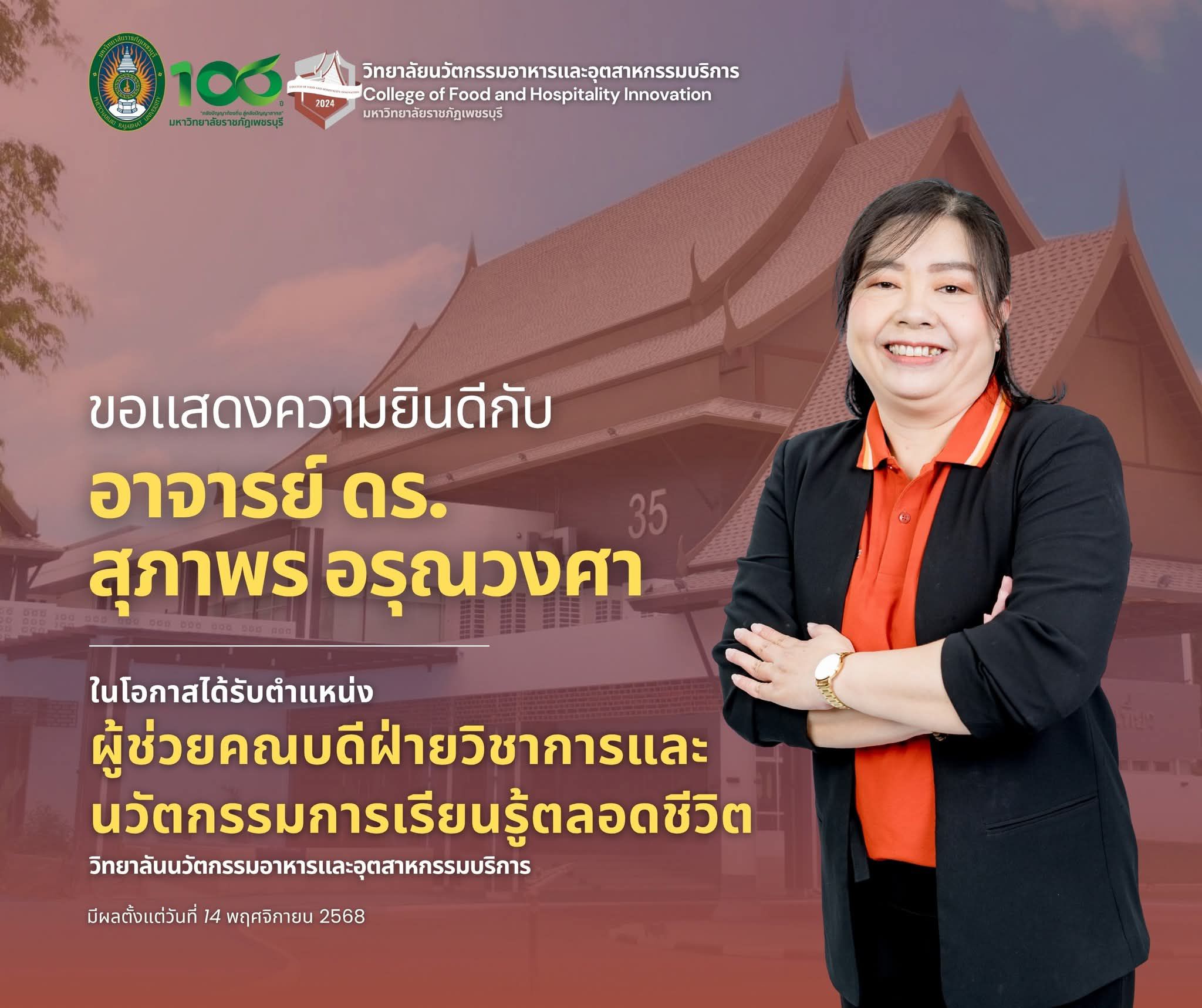 ขอแสดงความยินดีกับอาจารย์ ดร.สุภาพร อรุณวงศา อาจารย์ประจำสาขาวิชาภาษาจีนเพื่อธุรกิจและบริการ วิทยาลัยนวัตกรรมอาหารและอุตสาหกรรมบริการ