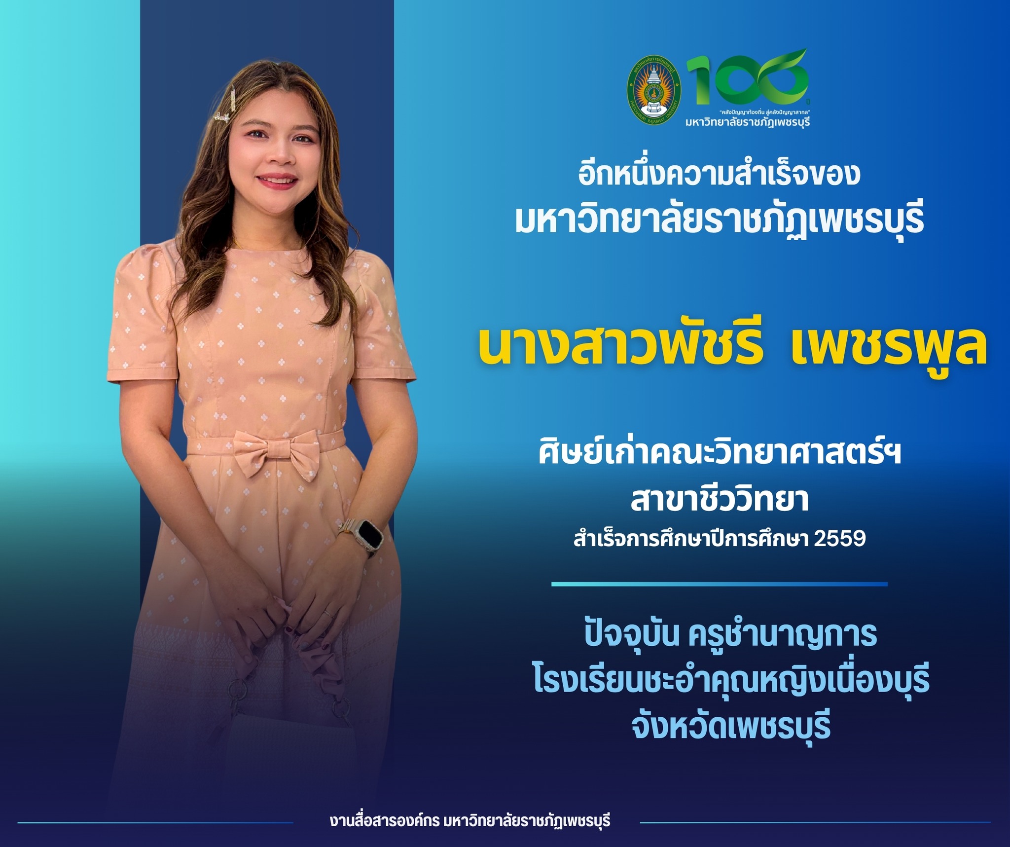 อีกหนึ่งความสำเร็จของมหาวิทยาลัยราชภัฏเพชรบุรี นางสาวพัชรี เพชรพูล ศิษย์เก่าคณะวิทยาศาสตร์และเทคโนโลยี สาขาชีววิทยา