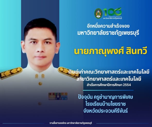 อีกหนึ่งความสำเร็จของมหาวิทยาลัยราชภัฏเพชรบุรี นายภาณุพงศ์ สินทวี ศิษย์เก่าคณะวิทยาศาสตร์และเทคโนโลยี สาขาวิทยาศาสตร์และเทคโนโลยี