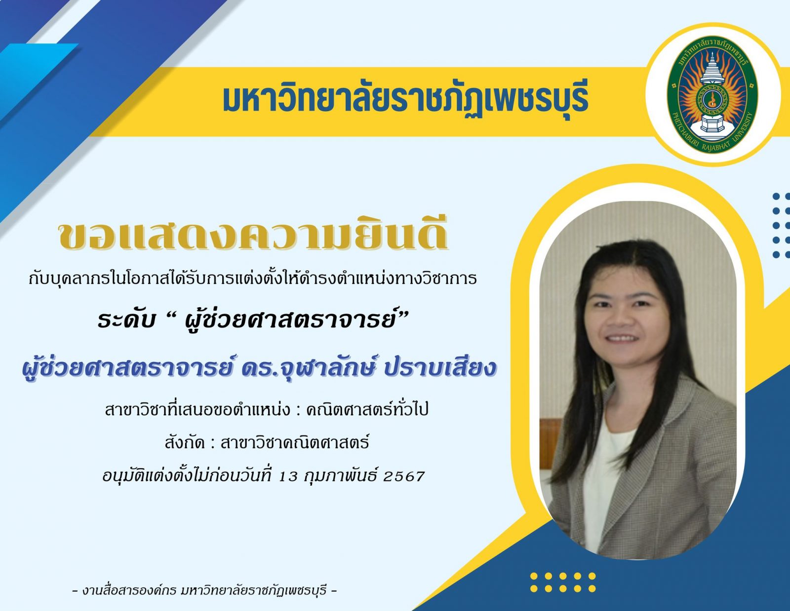 ขอแสดงความยินดีกับบุคลากรในโอกาสได้รับการแต่งตั้งให้ดำรงตำแหน่งทางวิชาการระดับ “ ผู้ช่วยศาสตราจารย์” 10 กุมภาพันธ์ 202510 กุมภาพันธ์ 2025piyanunข่าวประชาสัมพันธ์, ข่าวสำหรับบุคลากร, ข่าวสื่อสารองค์กร จำนวนผู้ชม : 8 ขอแสดงความยินดีกับบุคลากรในโอกาสได้รับการแต่งตั้งให้ดำรงตำแหน่งทางวิชาการระดับ “ ผู้ช่วยศาสตราจารย์” มหาวิทยาลัยราชภัฏเพชรบุรีขอแสดงความยินดี กับบุคลากรในโอกาสได้รับการแต่งตั้งให้ดำรงตำแหน่งทางวิชาการระดับ “ ผู้ช่วยศาสตราจารย์”ผู้ช่วยศาสตราจารย์ ดร.จุฬาลักษ์ ปราบเสียงสาขาวิชาที่เสนอขอตำแหน่ง : คณิตศาสตร์ทั่วไปสังกัด : สาขาวิชาคณิตศาสตร์อนุมัติแต่งตั้งไม่ก่อนวันที่ 13 กุมภาพันธ์ 2567 Facebook iconFacebookTwitter iconTwitterLINE iconLine