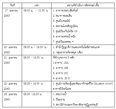 มรภ.เพชรบุรี เดินหน้าสร้างความมั่นใจ ฉีดพ่นยาฆ่าเชื้อโควิด-19 รอบมหาวิทยาลัยฯ 17 เมษายน 2020Thitiporn Karaketข่าวสื่อสารองค์กร จำนวนผู้ชม : 170 มหาวิทยาลัยราชภัฏเพชรบุรี เดินหน้าฉีดพ่นยาฆ่าเชื้อ COVID-19 สร้างความมั่นใจให้กับนักศึกษาและบุคลากร กลุ่มงานพัฒนากายภาพ ภูมิสถาปัตย์และสิ่งแวดล้อม มหาวิทยาลัยราชภัฏเพชรบุรี นำโดยผู้ช่วยศาสตราจารย์ ดร.เสนาะ กลิ่นงาม อธิการบดีมหาวิทยาลัยราชภัฏเพชรบุรี ดำเนินการฉีดพ่นน้ำยาฆ่าเชื้อเพื่อลดความเสี่ยงและป้องกันการแพร่ระบาดของไวรัสโคโรนา 2019 (COVID-19) โดยจะดำเนินการตั้งแต่วันที่ 17 – 23 เมษายน 2563 ตั้งแต่เวลา 08.00 – 16.00 น. เพื่อสร้างความมั่นใจให้กับบุคลากร นักศึกษาและผู้มาติดต่อราชการ โดยมีแผนการดำเนินงาน ดังนี้ Facebook iconFacebookTwitter iconTwitterLINE iconLine