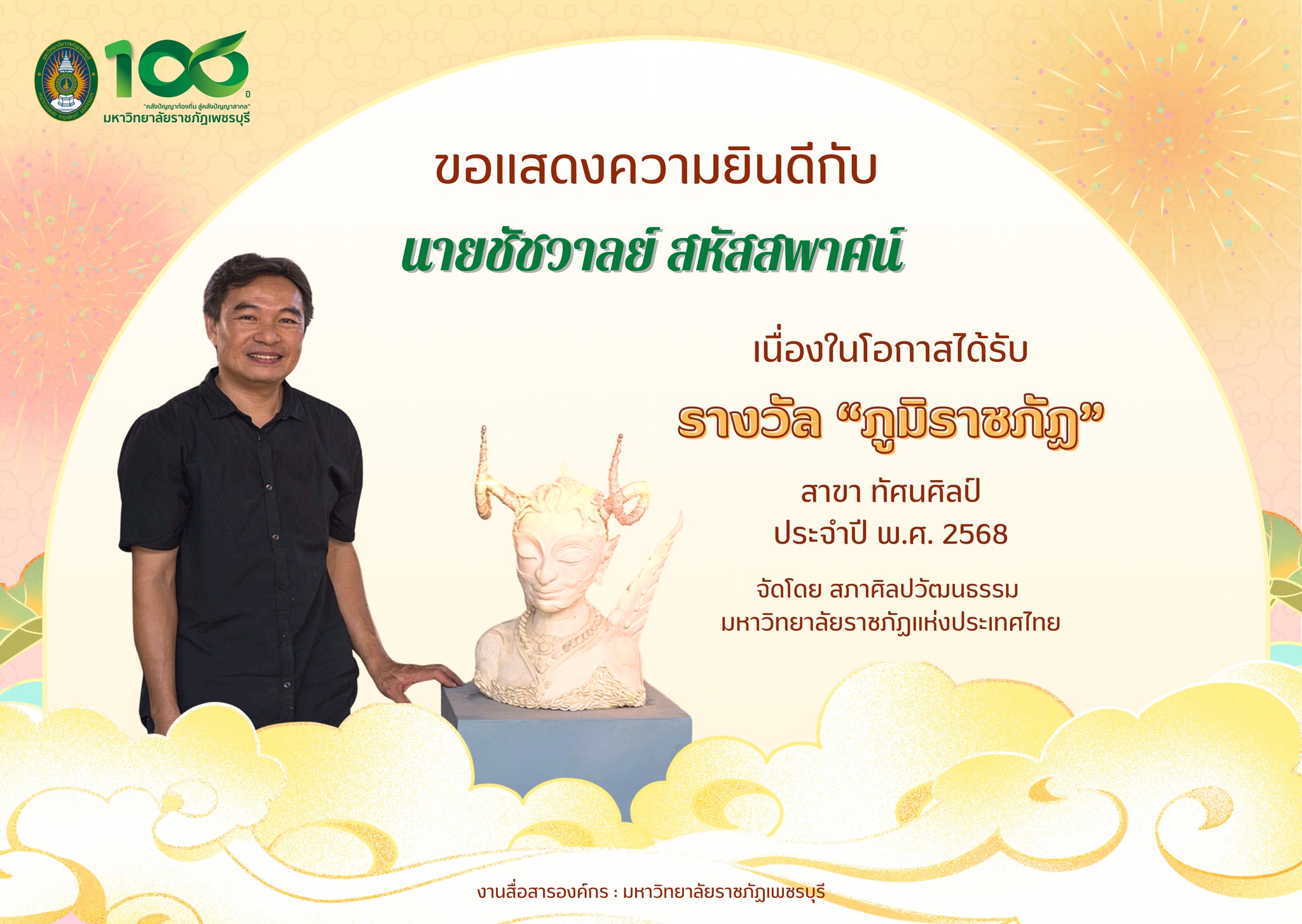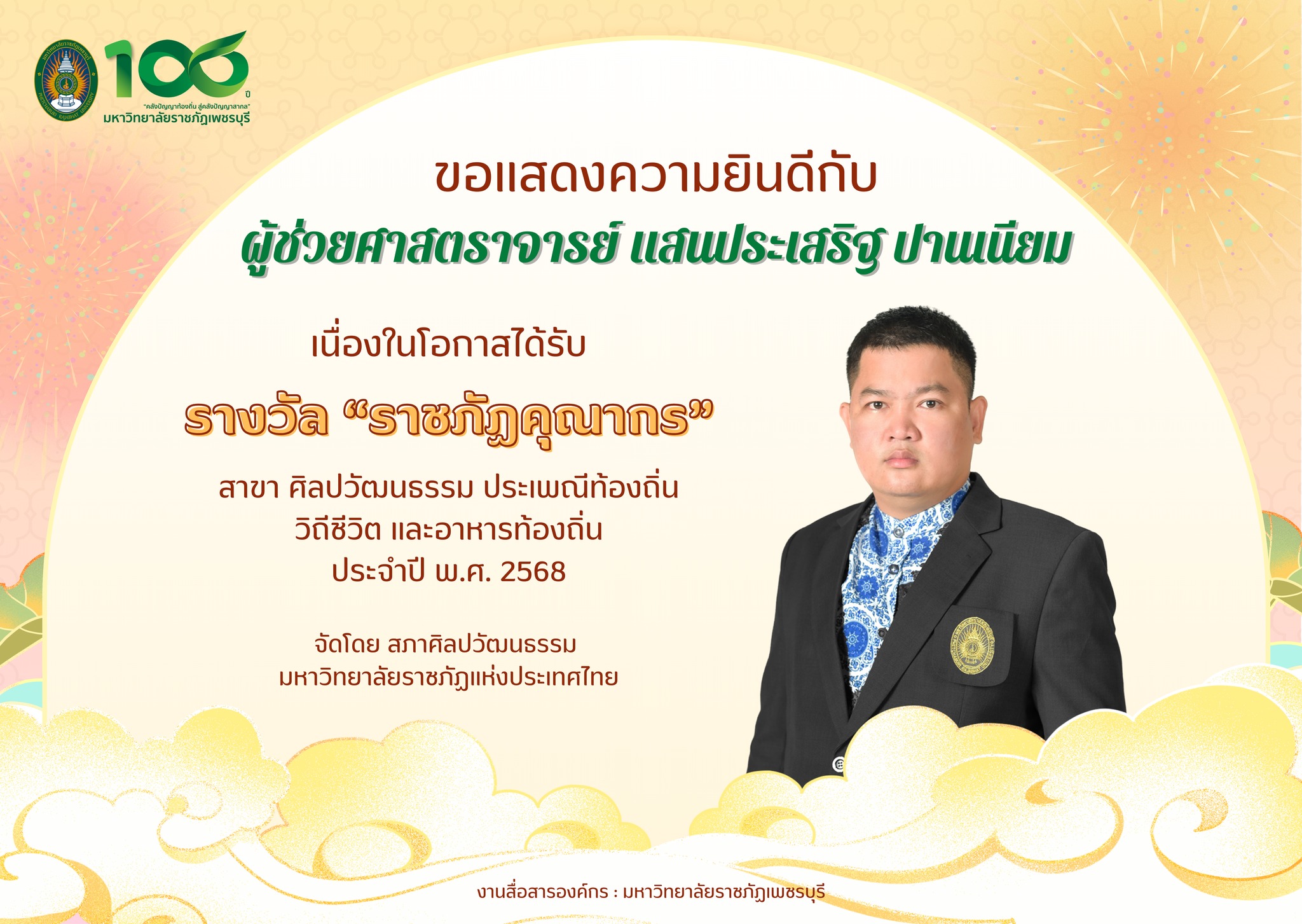 มหาวิทยาลัยราชภัฏเพชรบุรีขอแสดงความยินดี 4 มีนาคม 20254 มีนาคม 2025piyanunข่าวประชาสัมพันธ์, ข่าวสำหรับบุคลากร, ข่าวสื่อสารองค์กร จำนวนผู้ชม : 29 มหาวิทยาลัยราชภัฏเพชรบุรีขอแสดงความยินดี มหาวิทยาลัยราชภัฏเพชรบุรีขอแสดงความยินดีกับผู้ช่วยศาสตราจารย์ แสนประเสริฐ ปานเนียมเนื่องในโอกาสได้รับรางวัล “ราชภัฏคุณากร” สาขา ศิลปวัฒนธรรม ประเพณีท้องถิ่น วิถีชีวิต และอาหารท้องถิ่นประจำปี พ.ศ. 2568——————————————————————และขอแสดงความยินดีกับนายชัชวาลย์ สหัสสพาศน์เนื่องในโอกาสได้รับรางวัล “ภูมิราชภัฏ” สาขา ทัศนศิลป์ ประจำปี พ.ศ. 2568จัดโดย สภาศิลปวัฒนธรรมมหาวิทยาลัยราชภัฏแห่งประเทศไทย Facebook iconFacebookTwitter iconTwitterLINE iconLine