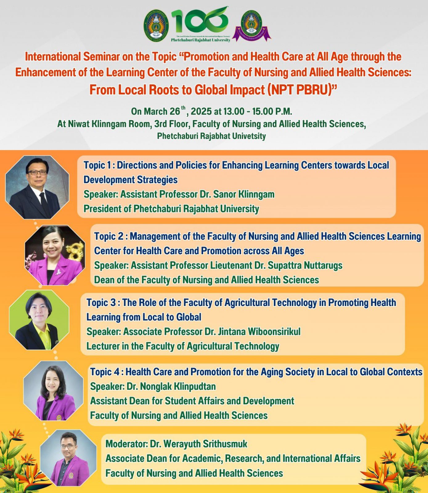 ขอเชิญเข้าร่วมรับฟังการสัมมนา ระดับนานาชาติ เรื่อง “Promotion and Health Care at All Age through the Enhancement of the Learning Center of the Faculty of Nursing and Allied Health Sciences: From Local Roots to Global Impact (NPT PBRU)”