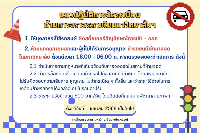 แนวปฏิบัติการจัดระเบียบด้านการจราจรภายในมหาวิทยาลัยราชภัฏเพชรบุรี 26 พฤษภาคม 202526 พฤษภาคม 2025piyanunข่าวประชาสัมพันธ์, ข่าวสำหรับบุคลากร, ข่าวสื่อสารองค์กร จำนวนผู้ชม : 13 แนวปฏิบัติการจัดระเบียบด้านการจราจรภายในมหาวิทยาลัยราชภัฏเพชรบุรี แนวปฏิบัติการจัดระเบียบด้านการจราจรภายในมหาวิทยาลัยราชภัฏเพชรบุรี 1. ให้บุคลากรที่ใช้รถยนต์ ติดสติ๊กเกอร์สัญลักษณ์การเข้า – ออก โดยขอรับสติ๊กเกอร์ได้ที่ งานบริหารทั่วไป2. ห้ามบุคคลภายนอกและผู้ที่ไม่ได้รับการอนุญาต นำรถยนต์เข้ามาจอดในทุก ๆ พื้นที่ของมหาวิทยาลัย รวมถึงจอดบริเวณอาคารต่าง ๆ ตั้งแต่เวลา 18.00 – 06.00 น. หากตรวจพบจะดำเนินการ ดังนี้2.1) ดำเนินการตามกฎหมายที่เกี่ยวข้องกับการจอดรถในสถานที่ห้ามจอด2.2) ทำการล็อคล้อหรือเคลื่อนย้ายรถไปยังสถานที่ที่กำหนด โดยมหาวิทยาลัยไม่รับผิดชอบความเสียหาย สูญหาย ไม่ว่ากรณีใด ๆ ทั้งสิ้น และชำระค่าใช้จ่ายในการเคลื่อนย้ายรถกรณีดังกล่าวโดยไม่รวมค่าปรับ2.3) ผู้ขับขี่หรือผู้เป็นเจ้าของรถ มาขอรับรถยนต์ ต้องชำระค่าปรับจำนวน 500 บาท/คืน โดยติดต่อที่กลุ่มงานพัฒนากายภาพภูมิสถาปัตย์และสิ่งแวดล้อมประกาศให้ทราบโดยทั่วกันและถือปฏิบัติ ตั้งแต่วันที่ 1 เมษายน 2568 เป็นต้นไป Facebook iconFacebookTwitter iconTwitterLINE iconLine