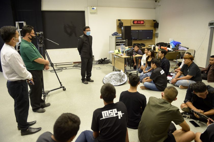 ผู้ช่วยศาสตราจารย์ ดร.เสนาะ กลิ่นงาม อธิการบดีมหาวิทยาลัยราชภัฏเพชรบุรี กล่าวชื่นชมและให้กำลังใจนักศึกษาสาขาวิชานิเทศศาสตร์และทีมงาน ที่กำลังถ่ายทำมิวสิควิดีโอเพลง “ราชภัฏเพชรบุรีส่งใจ สู้ภัยโควิด” ที่แต่ง เรียบเรียงและใส่ทำนองขึ้นเอง ณ สตูดิโอสาขาวิชานิเทศศาสตร์ ชั้น 7 คณะวิทยาการจัดการ มหาวิทยาลัยราชภัฏเพชรบุรี เพื่อให้กำลังใจบุคลากรทางการแพทย์และคนไทยทุกคนในช่วงสถานการณ์การแพร่ระบาดของโรคไวรัสโคโรน่า (COVID-19) โดยมีอาจารย์ ดร.วิวิศณ์ สุขแสงอร่าม คณบดีคณะวิทยาการจัดการ พร้อมด้วยผู้ช่วยศาสตราจารย์รพีพรรณ เทียมเดช คณบดีคณะมนุษยศาสตร์และสังคมศาสตร์ และอาจารย์ ดร.เมธาวิน สาระยาน ประธานสาขาวิชานิเทศศาสตร์ ให้การต้อนรับ