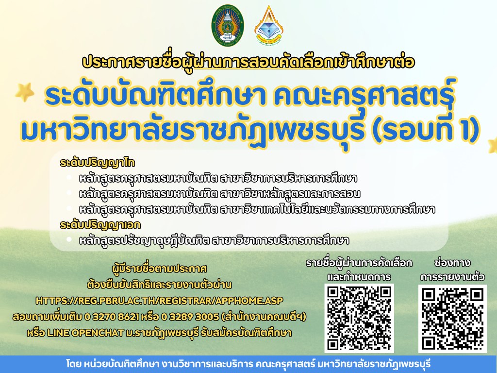 ประกาศรายชื่อผู้ผ่านการสอนคัดเลือกเข้าศึกษาระดับบัณฑิตศึกษา คณะครุศาสตร์ มหาวิทยาลัยราชภัฏเพชรบุรี 10 มิถุนายน 202516 มิถุนายน 2025piyanunข่าวประชาสัมพันธ์, ข่าวสำหรับนักศึกษา, ข่าวสำหรับบุคลากร, ข่าวสื่อสารองค์กร จำนวนผู้ชม : 22 ประกาศรายชื่อผู้ผ่านการสอนคัดเลือกเข้าศึกษาระดับบัณฑิตศึกษา คณะครุศาสตร์ มหาวิทยาลัยราชภัฏเพชรบุรี Facebook iconFacebookTwitter iconTwitterLINE iconLine