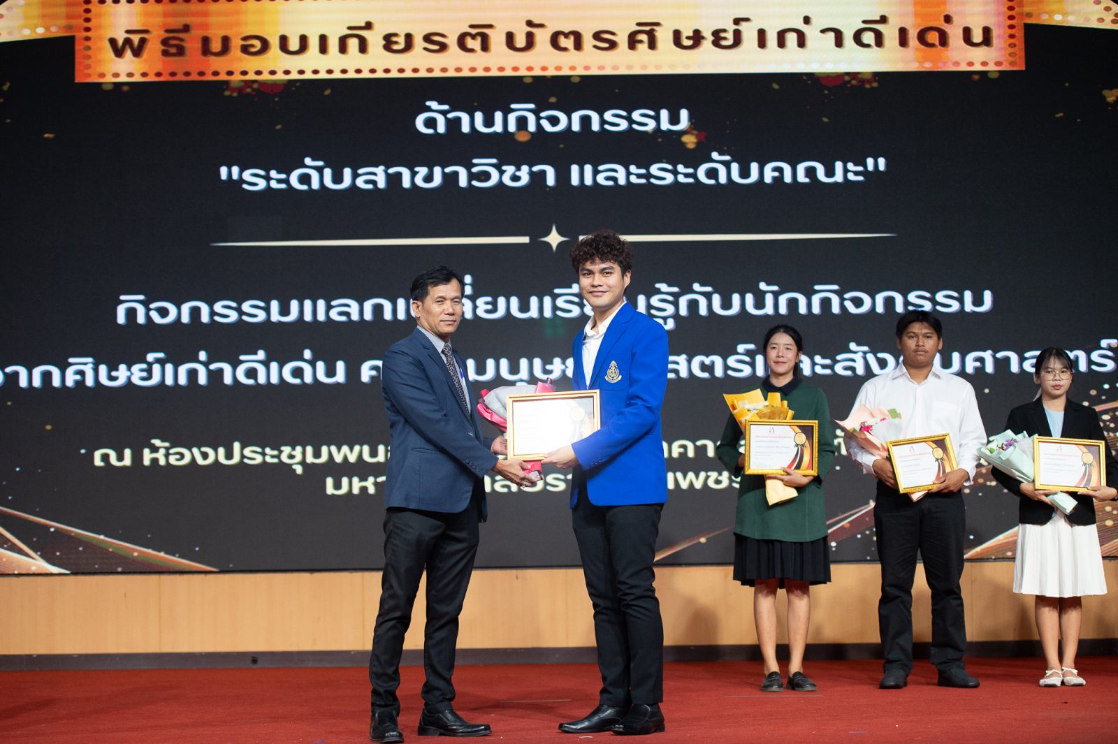 คณะมนุษยศาสตร์และสังคมศาสตร์ มอบประกาศนียบัตรเชิดชูเกียรติให้แก่ศิษย์เก่าที่ดีเด่นด้านกิจกรรม 20 มิถุนายน 202524 มิถุนายน 2025piyanunข่าวประชาสัมพันธ์, ข่าวสำหรับบุคลากร, ข่าวสื่อสารองค์กร จำนวนผู้ชม : 10 คณะมนุษยศาสตร์และสังคมศาสตร์ มอบประกาศนียบัตรเชิดชูเกียรติให้แก่ศิษย์เก่าที่ดีเด่นด้านกิจกรรม รองศาสตราจารย์ ดร.ศุภณัฏฐ์ ทรัพย์นาวิน คณบดีคณะมนุษยศาสตร์และสังคมศาสตร์ พร้อมด้วยคณะผุ้บริหารและคณาจารย์คณะมนุษยศาสตร์และสังคมศาสตร์ มอบประกาศนียบัตรเชิดชูเกียรติให้แก่ศิษย์เก่าที่ดีเด่นด้านกิจกรรม ในกิจกรรมปฐมนิเทศนักศึกษาใหม่ประจำปี 2568 เมื่อวันที่ 16 มิถุนายน 2668 ณ ห้องประชุมพนอมแก้วกำเนิด อาคารสุเมธตันติเวชกุล มหาวิทยาลัยราชภัฏเพชรบุรีโดยศิษย์เก่าที่ได้รับรางวัล ประกอบด้วย1.ผู้ช่วยศาสตราจารย์สมชาย สะอาดนัก ศิษย์เก่าดีเด่นสาขาวิชาดนตรีศึกษา2. นายทรงกลด ตั้งกิจวัฒนากูล ศิษย์เก่าดีเด่นสาขาวิชารัฐประศาสนศาสตร์3. นายสุริยะ อรุณแสนไชยา ศิษย์เก่าดีเด่นสาขาวิชาการบริหารการพัฒนาสังคม4. นายชนสรณ์ คุณาธิมาพันธ์ ศิษย์เก่าดีเด่นสาขาวิชานวัตกรรมการท่องเที่ยวและการโรงแรม5. นายณัฐวัฒน์ ทองใส ศิษย์เก่าดีเด่นสาขาวิชานาฏศิลป์ศึกษา6. นายโกวิท ทองมาก ศิษย์เก่าดีเด่นสาขาวิชาภาษาไทย7.นางสาวสรัญญา เหี้ยมหาญ ศิษย์เก่าดีเด่นสาขาวิชาภาษาจีน8.นางสาวณัฐชา จันทับ ศิษย์เก่าดีเด่นสาขาวิชานิติศาสตร์9.นายกฤษกร สัญจร ศิษย์เก่าดีเด่นสาขาวิชาศิลปะการออกแบบ10.นางสาวกมลลักษณ์ วิริยะขันติพงษ์ ศิษย์เก่าดีเด่นสาขาวิชาศิลปศึกษา11.นายพงษ์สิทธิ์ แซ่ลิ้ม ศิษย์เก่าดีเด่นสาขาวิชาสังคมศึกษา12.นางสาวพัชรพร แต้มริด ศิษย์เก่าดีเด่นสาขาวิชาการจัดการสารสนเทศและดิจิทัลคอนเทนต์13.นางสาวปรียาภัทร ทองจำนงค์ ศิษย์เก่าดีเด่นสาขาวิชาภาษาอังกฤษ (คบ.)14.นายสุรสร แสงอาทิตย์ ศิษย์เก่าสาขาวิชาภาษาอังกฤษธุรกิจ (ศศบ.) Facebook iconFacebookTwitter iconTwitterLINE iconLine