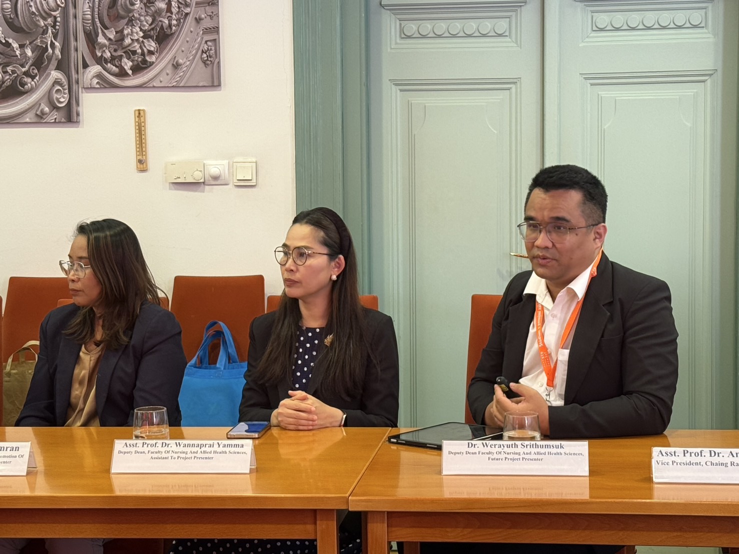 ผศ.ดร.เสนาะ กลิ่นงาม อธิการบดีมหาวิทยาลัยราชภัฏเพชรบุรี นำคณะผู้บริหารจากมหาวิทยาลัยราชภัฏเพชรบุรี กาญจนบุรี และเชียงราย ปรึกษาหารือความร่วมมือด้านวิชาการ และการวิจัยทางด้านวิทยาการสุขภาพและการท่องเที่ยวเชิงสุขภาพกับคณะผู้บริหารของ Faculty of Health Sciences, Semmelweis University มหาวิทยาลัยอันดับหนึ่งและเก่าแก่ที่สุดทางด้านการแพทย์และวิทยาศาสตร์สุขภาพ ของประเทศฮังการี นำโดย Prof. Dr. Gabriella Dörnyei Bednárik Dean, Faculty of Health Sciences, Semmelweis University พร้อมด้วย Dr. Tamás Hegedüs, Director for International Relations and Alumni Affairs; Prof. Dr. Klára Gadó, Vice-Dean for General Affairs; Prof. Dr. István Vingender habil, Vice-Dean for Academic Affairs; Lect. Lőrincz Attila, Department of Nursing และ Prof. Dr. FEITH Helga Judit, Head of Department of Social Sciences ณ กรุงบูดาเปสต์ ประเทศฮังการี