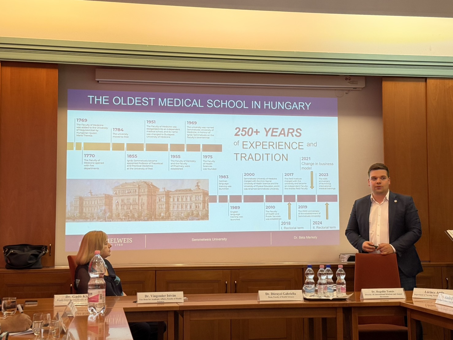 Dr. Tamás Hegedüs, Director for International Relations and Alumni Affairs ได้นำเสนอข้อมูลเกี่ยวกับ Semmelweis University ว่าเป็นมหาวิทยาลัยอันดับหนึ่งและเก่าแก่ที่สุดทางด้านการแพทย์และวิทยาศาสตร์สุขภาพ ของประเทศฮังการี ก่อตั้งเมื่อ ค.ศ. 1769 โดยชื่อของมหาวิทยาลัยเป็นชื่อของนายแพทย์ Semmelweis ที่เป็นผู้คิดค้นการล้างมือคนแรกของโลก ประกอบด้วย 6 คณะ ทางด้านการแพทย์และวิทยาศาสตร์สุขภาพ ปัจจุบันมีนักศึกษาประมาณ 16,000 คน และบุคลากรจำนวน 12,000 คน โดย 1 ใน 3 ของนักศึกษาคือนักศึกษาต่างชาติจาก 5 ทวีปทั่วโลก โดยมหาวิทยาลัยมีความโดดเด่นเป็นอย่างมากทางด้านการแพทย์ ทันตแพทย์ เภสัชศาสตร์ พยาบาลศาสตร์และวิทยาศาสตร์สุขภาพอื่น ๆ ที่เกี่ยวข้อง ซึ่งถือเป็นมหาวิทยาลัยที่ผลิตบุคลากรทางการแพทย์ที่ใหญ่ที่สุดในประเทศฮังการี มีผลงานวิจัยและนวัตกรรมโดดเด่นทางด้านการวินิจฉัยและการรักษาทางการแพทย์ การป้องกันและส่งเสริมสุขภาพผู้สูงอายุ