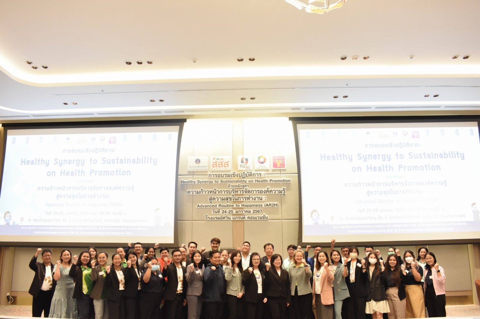 ในวันที่ 24-25 มกราคม 2567 ตัวแทนนักสร้างสุขมหาวิทยาลัยราชภัฎเพชรบุรีเข้าร่วม การอบรมเชิงปฏิบัติการ : Healthy Synergy to Sustainability on Health Promotion ด้วยหลักสูตร “ความก้าวหน้าการบริหารจัดการองค์ความรู้สู่ความสุขในการทํางาน : Advanced Routine to Happiness (AR2H) จัดโดยโครงการศูนย์วิชาการมหาวิทยาลัยแห่งความสุขกับการสร้างเสริมสุขภาพอย่างยั่งยืน สถาบันวิจัยประชากรและสังคม มหาวิทยาลัยมหิดล ร่วมกับ สำนักสนับสนุนสุขภาวะองค์กร สำนักงานกองทุนสนับสนุนการสร้างเสริมสุขภาพ (สสส.) ณ ห้องประชุมพระวิษณุ ชั้น 3 โรงแรมอัศวินแกรนด์ คอนเวนชั่น กรุงเทพมหานคร โดยมีภาคีเครือข่ายมหาวิทยาลัยแห่งความสุข (ภคม.) ที่มาเข้าร่วมได้แก่