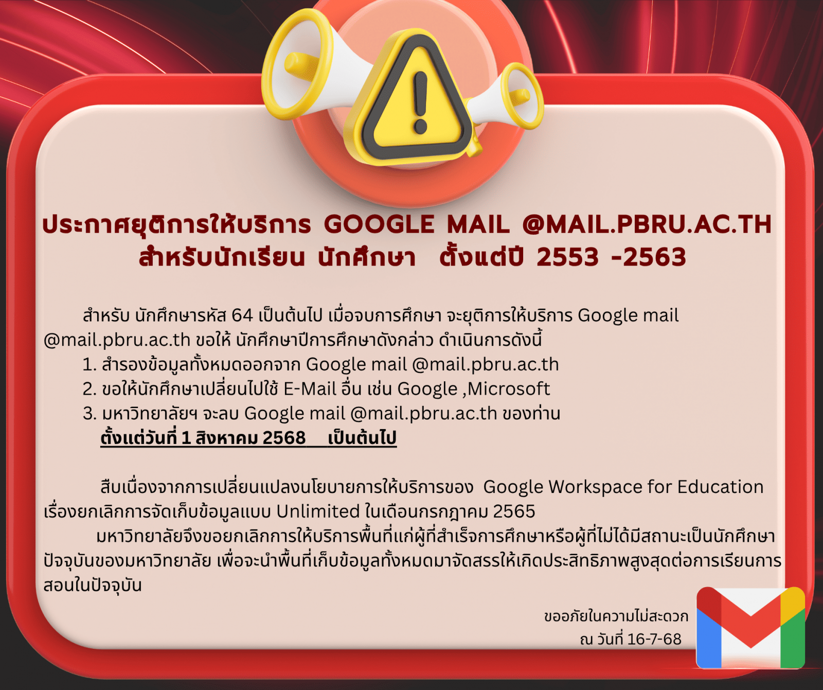 ประกาศยุติการให้บริการ Google mail @mail.pbru.ac.th