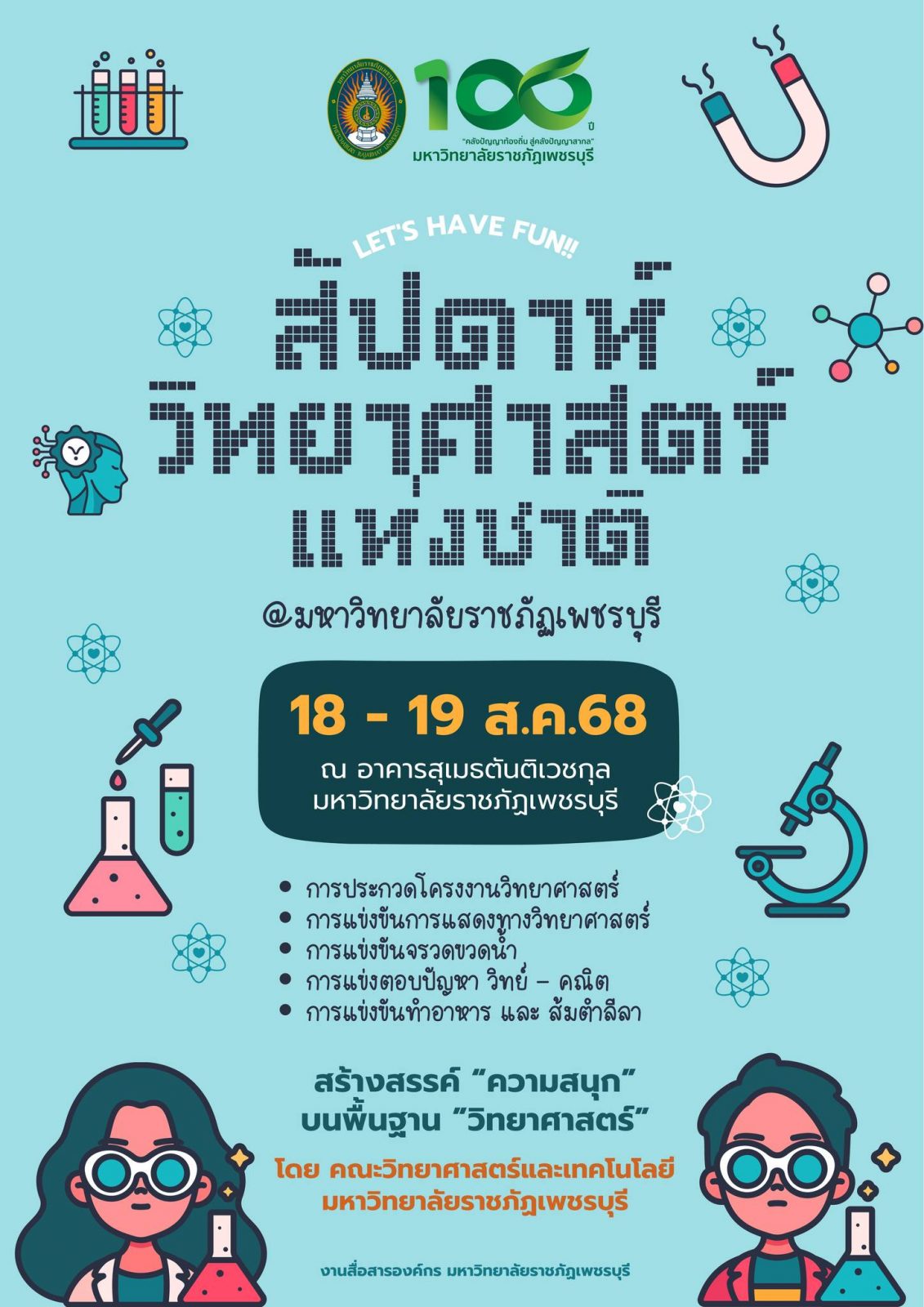 สัปดาห์วิทยาศาสตร์แห่งชาติ”มหาวิทยาลัยราชภัฏเพชรบุรี ประจำปี 2568 18 สิงหาคม 202518 สิงหาคม 2025piyanunข่าวประชาสัมพันธ์, ข่าวสำหรับบุคลากร, ข่าวสื่อสารองค์กร จำนวนผู้ชม : 40 เริ่มงานแล้วจ้าากับงาน ” สัปดาห์วิทยาศาสตร์แห่งชาติ”@มหาวิทยาลัยราชภัฏเพชรบุรี ประจำปี 2568มาร่วมค้นหา ” ความสนุก ” บนพื้นฐาน ” วิทยาศาสตร์ “กับกิจกรรมต่าง ๆ มากมาย อาทิการประกวดโครงงานวิทยาศาสตร์การแข่งขันการแสดงทางวิทยาศาสตร์การแข่งขันจรวดขวดน้ำการแข่งตอบปัญหา วิทย์ – คณิตการแข่งขันทำอาหาร และ ส้มตำลีลา18 – 19 สิงหาคมนี้ณ อาคารสุเมธตันติเวชกุลมหาวิทยาลัยราชภัฏเพชรบุรีสร้างสรรค์กิจกรรมโดยคณะวิทยาศาสตร์และเทคโนโลยีมหาวิทยาลัยราชภัฏเพชรบุรี#คณะวิทยาศาสตร์และเทคโนโลยีมหาวิทยาลัยราชภัฏเพชรบุรี#100ปีราชภัฏเพชรบุรี Facebook iconFacebookTwitter iconTwitterLINE iconLine