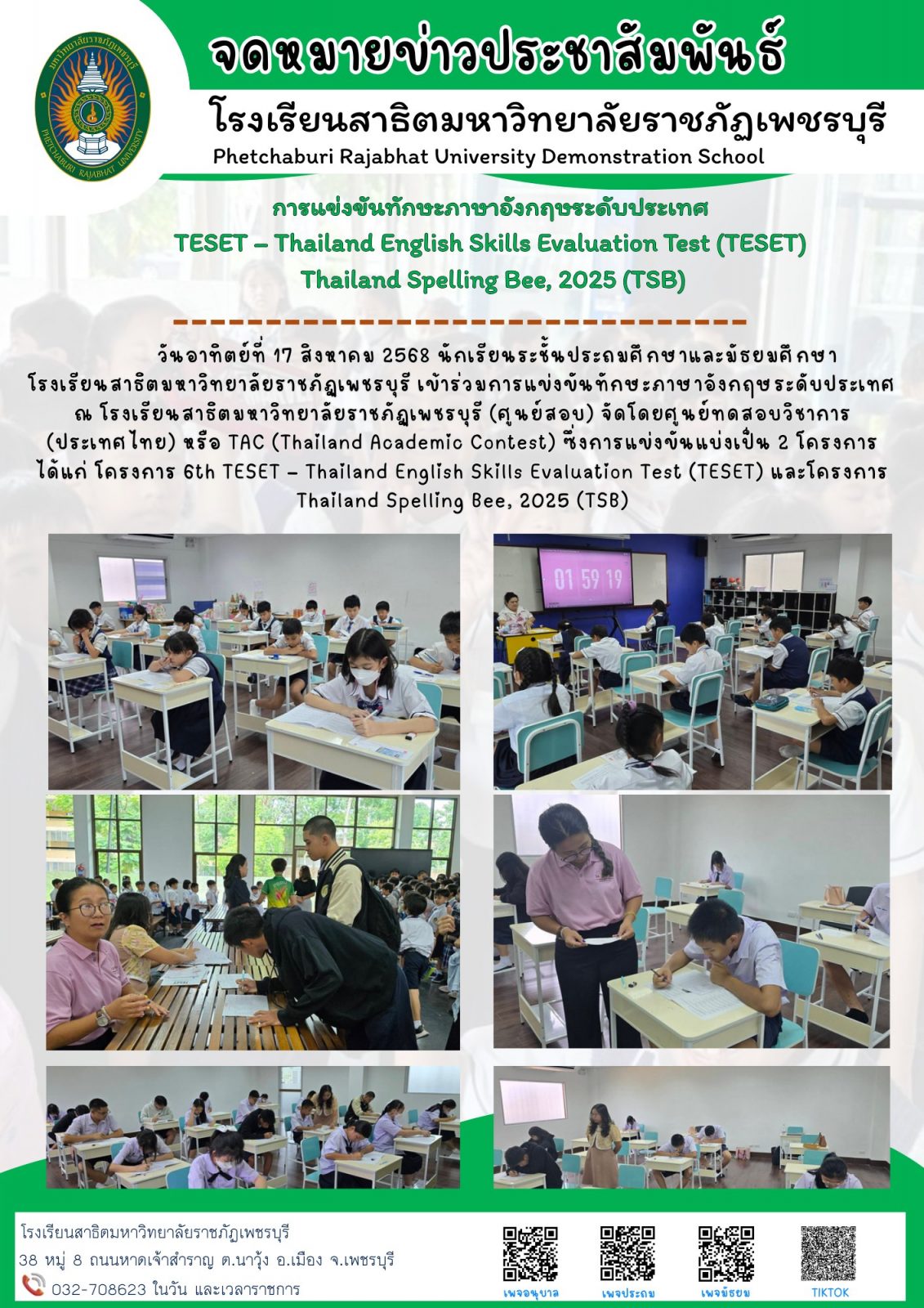 การแข่งขันทักษะภาษาอังกฤษระดับประเทศ ณ โรงเรียนสาธิตมหาวิทยาลัยราชภัฏเพชรบุรี 18 สิงหาคม 202518 สิงหาคม 2025piyanunกิจกรรมโรงเรียนสาธิตฯ, ข่าวประชาสัมพันธ์ จำนวนผู้ชม : 6 การแข่งขันทักษะภาษาอังกฤษระดับประเทศ ณ โรงเรียนสาธิตมหาวิทยาลัยราชภัฏเพชรบุรี โรงเรียนสาธิตมหาวิทยาลัยราชภัฏเพชรบุรี การแข่งขันทักษะภาษาอังกฤษระดับประเทศ ณ โรงเรียนสาธิตมหาวิทยาลัยราชภัฏเพชรบุรีวันอาทิตย์ที่ 17 สิงหาคม 2568 นักเรียนระดับชั้นประถมศึกษาและมัธยมศึกษาโรงเรียนสาธิตมหาวิทยาลัยราชภัฏเพชรบุรี เข้าร่วมการแข่งขันทักษะภาษาอังกฤษระดับประเทศ ณ อาคาร 3 โรงเรียนสาธิตมหาวิทยาลัยราชภัฏเพชรบุรี (ฝ่ายประถมศึกษา) (ศูนย์สอบ) จัดโดย ศูนย์ทดสอบวิชาการ (ประเทศไทย) หรือ TAC (Thailand Academic Contest) ซึ่งการแข่งขันแบ่งเป็น 2 โครงการ ได้แก่– ช่วงเช้า (10:00 – 12:00) : โครงการ 6th TESET – Thailand English Skills Evaluation Test (TESET)– ช่วงบ่าย (13:00 – 14:30) : โครงการ Thailand Spelling Bee, 2025 (TSB)#โรงเรียนสาธิตมหาวิทยาลัยราชภัฏเพชรบุรี#100ปีราชภัฏเพชรบุรี Facebook iconFacebookTwitter iconTwitterLINE iconLine