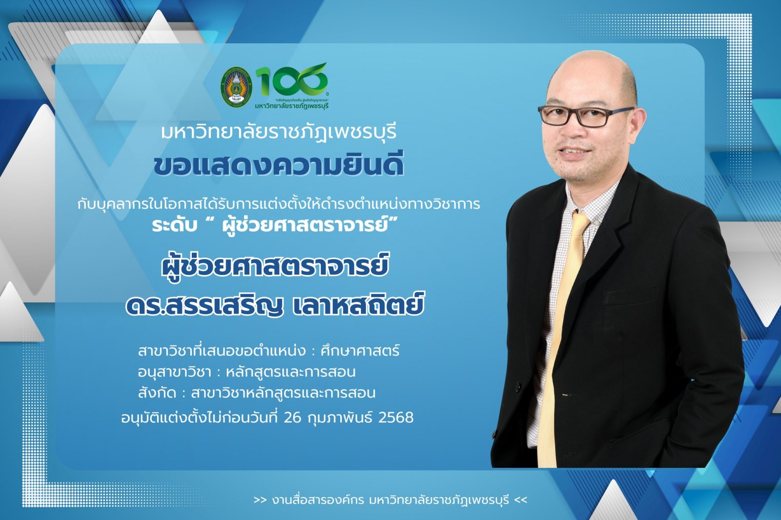 ขอแสดงความยินดีกับบุคลากรในโอกาสได้รับการแต่งตั้งให้ดำรงตำแหน่งทางวิชาการระดับ “ ผู้ช่วยศาสตราจารย์ ” 19 สิงหาคม 202519 สิงหาคม 2025piyanunข่าวประชาสัมพันธ์, ข่าวสำหรับบุคลากร, ข่าวสื่อสารองค์กร จำนวนผู้ชม : 6 ขอแสดงความยินดีกับบุคลากรในโอกาสได้รับการแต่งตั้งให้ดำรงตำแหน่งทางวิชาการระดับ “ ผู้ช่วยศาสตราจารย์ ” มหาวิทยาลัยราชภัฏเพชรบุรีขอแสดงความยินดีกับบุคลากรในโอกาสได้รับการแต่งตั้งให้ดำรงตำแหน่งทางวิชาการระดับ “ ผู้ช่วยศาสตราจารย์ ” ผู้ช่วยศาสตราจารย์ ดร.สรรเสริญ เลาหสถิตย์ สาขาวิชาที่เสนอขอตำแหน่ง : ศึกษาศาสตร์อนุสาขาวิชา : หลักสูตรและการสอนสังกัด : สาขาวิชาหลักสูตรและการสอนอนุมัติแต่งตั้งไม่ก่อนวันที่ 26 กุมภาพันธ์ 2568 #100ปีราชภัฏเพชรบุรี Facebook iconFacebookTwitter iconTwitterLINE iconLine