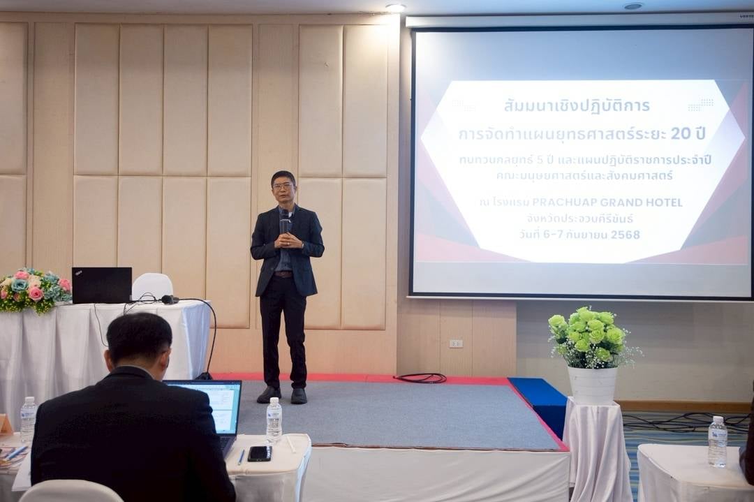 วันที่ 6-7 กันยายน 2568 รศ.ดร. ศุภณัฏฐ์ ทรัพย์นาวิน คณบดีคณะมนุษยศาสตร์และสังคมศาสตร์ เป็นประธานเปิดการสัมมนาเชิงปฏิบัติการ การจัดทำแผนยุทธศาสตร์ระยะ 20 ปีและทบทวนแผนกลยุทธ์ 5 ปี ของคณะมนุษยศาสตร์และสังคมศาสตร์ มหาวิทยาลัยราชภัฏเพชรบุรี ณ โรงแรมประจวบแกรนด์ จังหวัดประจวบคีรีขันธ์ โดยมีผู้บริหาร คณาจารย์ และบุคลากรของคณะมนุษยศาสตร์และสังคมศาสตร์เข้าร่วมการสัมมนา