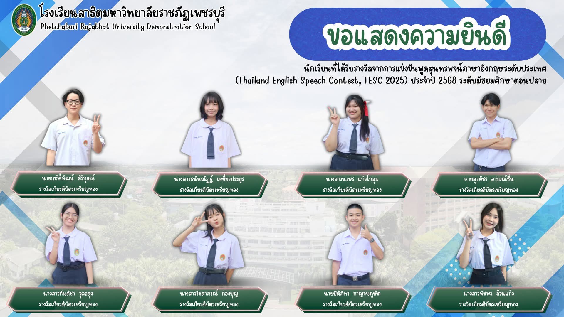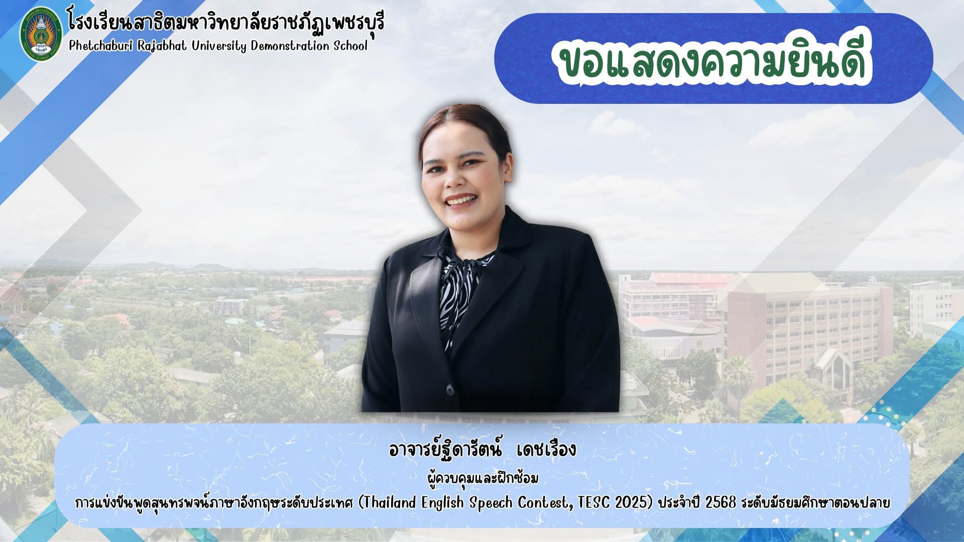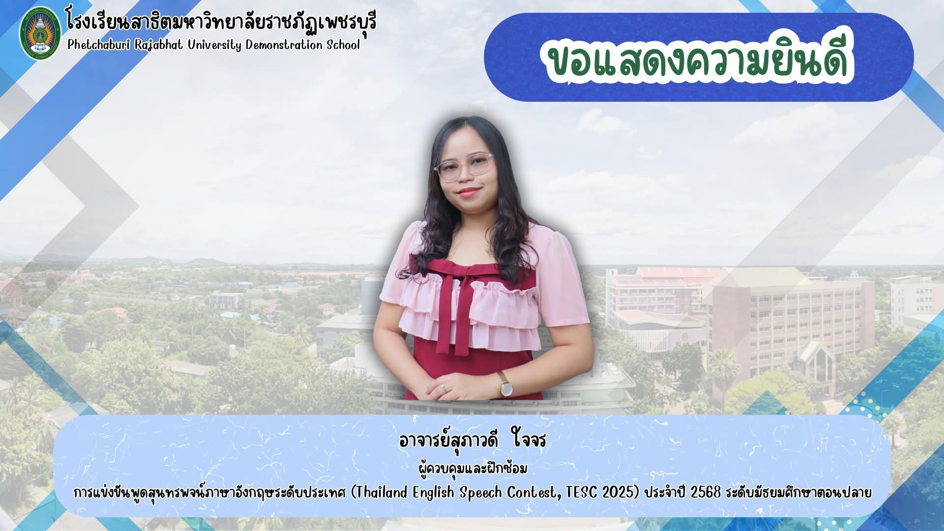 นักเรียนโรงเรียนสาธิตมหาวิทยาลัยราชภัฏเพชรบุรี เข้าร่วมโครงการแข่งขันการพูดสุนทรพจน์ภาษาอังกฤษระดับประเทศ ประจำปี พ.ศ. 2568 (Thailand English Speech Contest) ระดับมัธยมศึกษาตอนปลาย ที่บริษัท อคาเดมิค คอนเทสต์ (ประเทศไทย) จำกัด ร่วมกับสถาบันภาษา มหาวิทยาลัยธรรมศาสตร์กำหนดจัดขึ้น ระหว่างวันที่ 1 เมษายน – 4 สิงหาคม ที่ผ่านมา