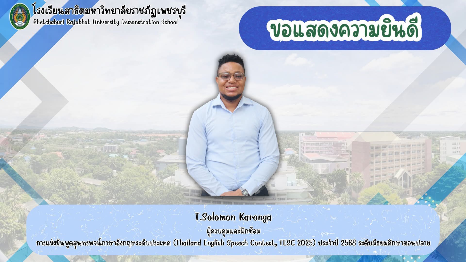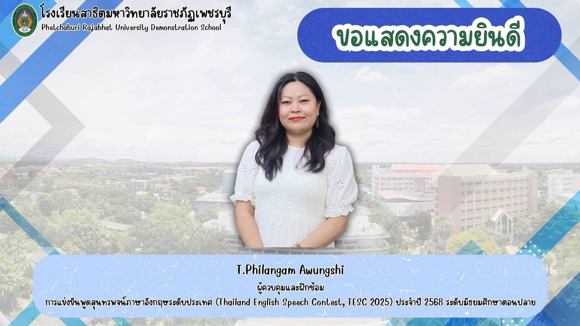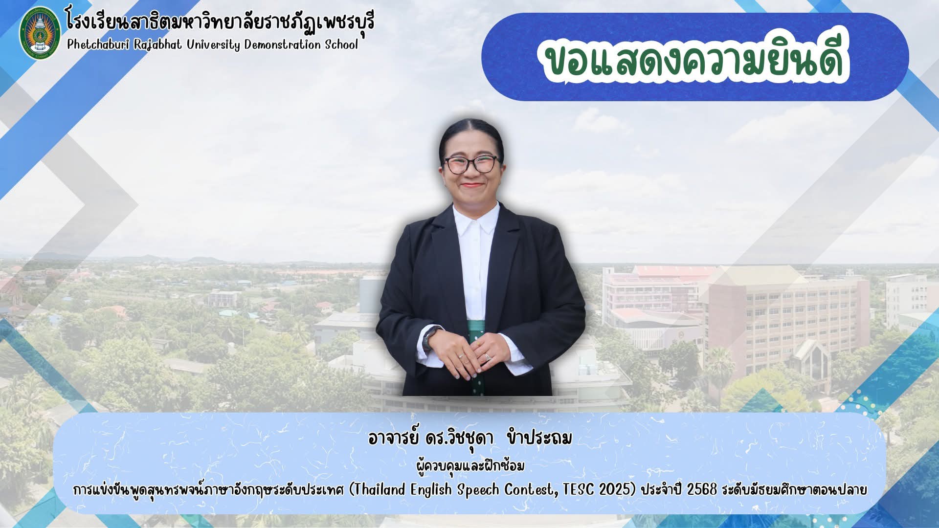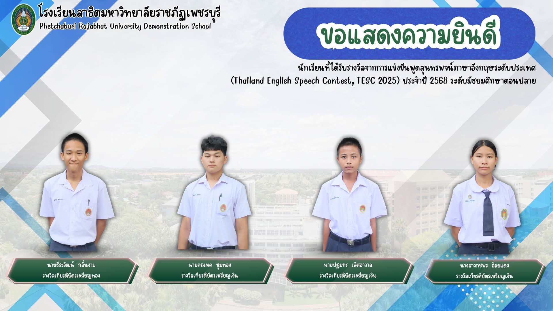 นักเรียนโรงเรียนสาธิตมหาวิทยาลัยราชภัฏเพชรบุรี เข้าร่วมโครงการแข่งขันการพูดสุนทรพจน์ภาษาอังกฤษระดับประเทศ ประจำปี พ.ศ. 2568 (Thailand English Speech Contest) ระดับมัธยมศึกษาตอนปลาย ที่บริษัท อคาเดมิค คอนเทสต์ (ประเทศไทย) จำกัด ร่วมกับสถาบันภาษา มหาวิทยาลัยธรรมศาสตร์กำหนดจัดขึ้น ระหว่างวันที่ 1 เมษายน – 4 สิงหาคม ที่ผ่านมา