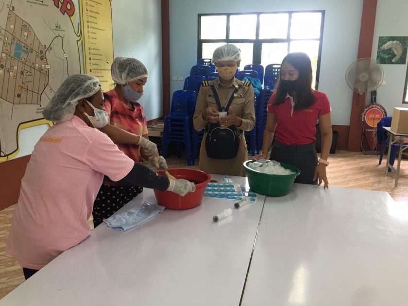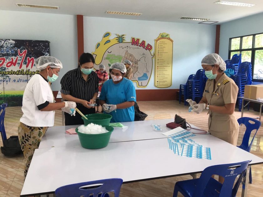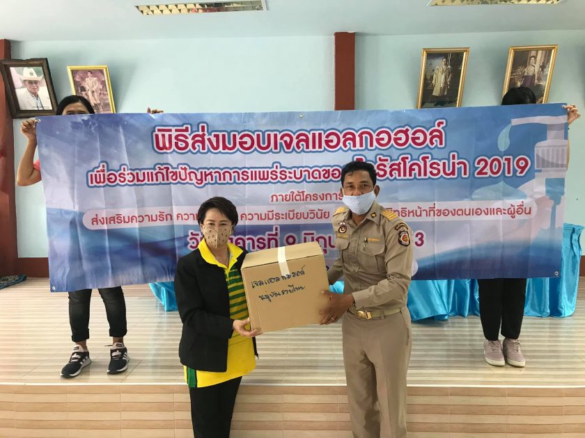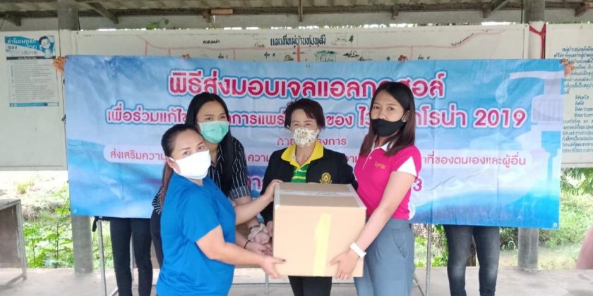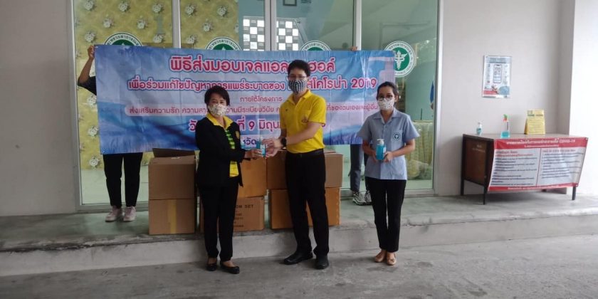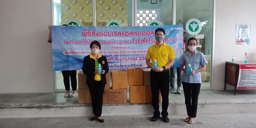 จากนั้นในช่วงบ่ายของวันเดียวกัน ได้ส่งมอบเจลแอลกอฮอล์ล้างมือให้กับหน่วยงานต่างๆ แบ่งเป็นแปบบขวด ขนาด 500 มิลลิลิตร จำนวน 250 ขวด มอบให้กับสำนักงานสาธารณสุขจังหวัดประจวบคีรีขันธ์ และแบบหลอด ขนาด 50 มิลลิลิตร จำนวน 500 หลอด มอบให้กับหมู่บ้านทุ่งพุฒิและหมู่บ้านรวมไทย แห่งละ 200 หลอด ตลอดจนโรงเรียนในพื้นที่อีก 100 หลอด