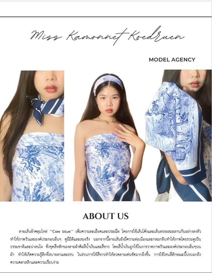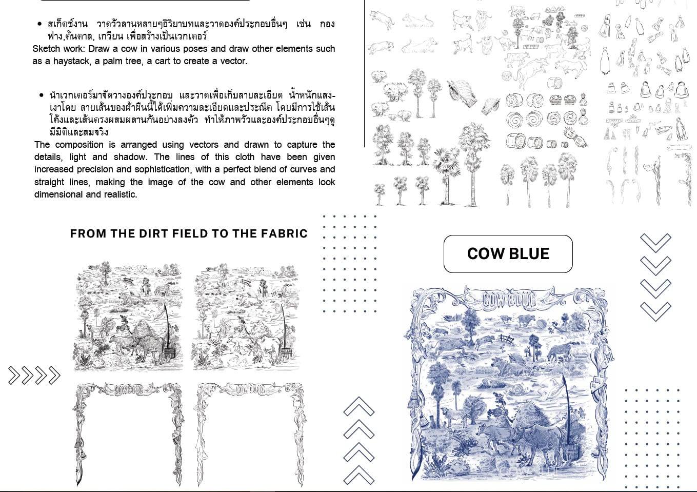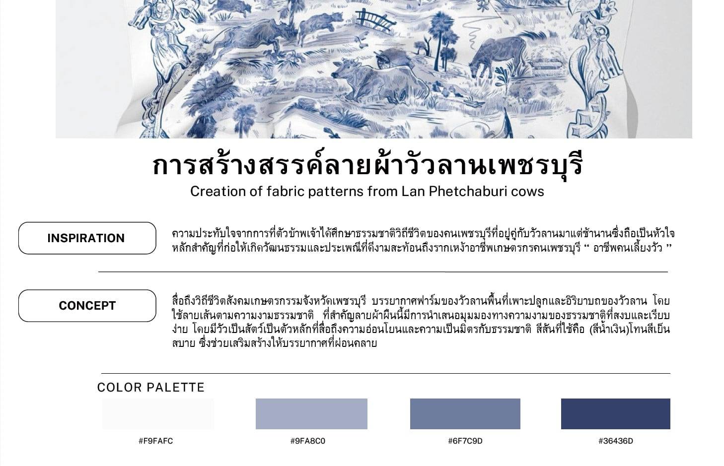 นางสาวกัญญาภัค ทองเอียง นักศึกษาสาขาวิชาศิลปะการออกแบบชั้นปีที่ 4 คณะมนุษยศาสตร์และสังคมศาสตร์ สร้างสรรค์ผลงานการออกแบบลายผ้า “Cow Blue” โดยนำวัวลานภูมิปัญญาทางวัฒนธรรม ด้านกีฬาและการละเล่นพื้นบ้านของคนเมืองเพชรที่มีมาอย่างยาวนาน พัฒนามาจากวัวนวดข้าวสู่การแข่งขันประลองกำลังความแข็งแกร่งและความเร็วของวัวทั้งสองฝ่ายคือวัวนอกกับฝ่ายวัวใน