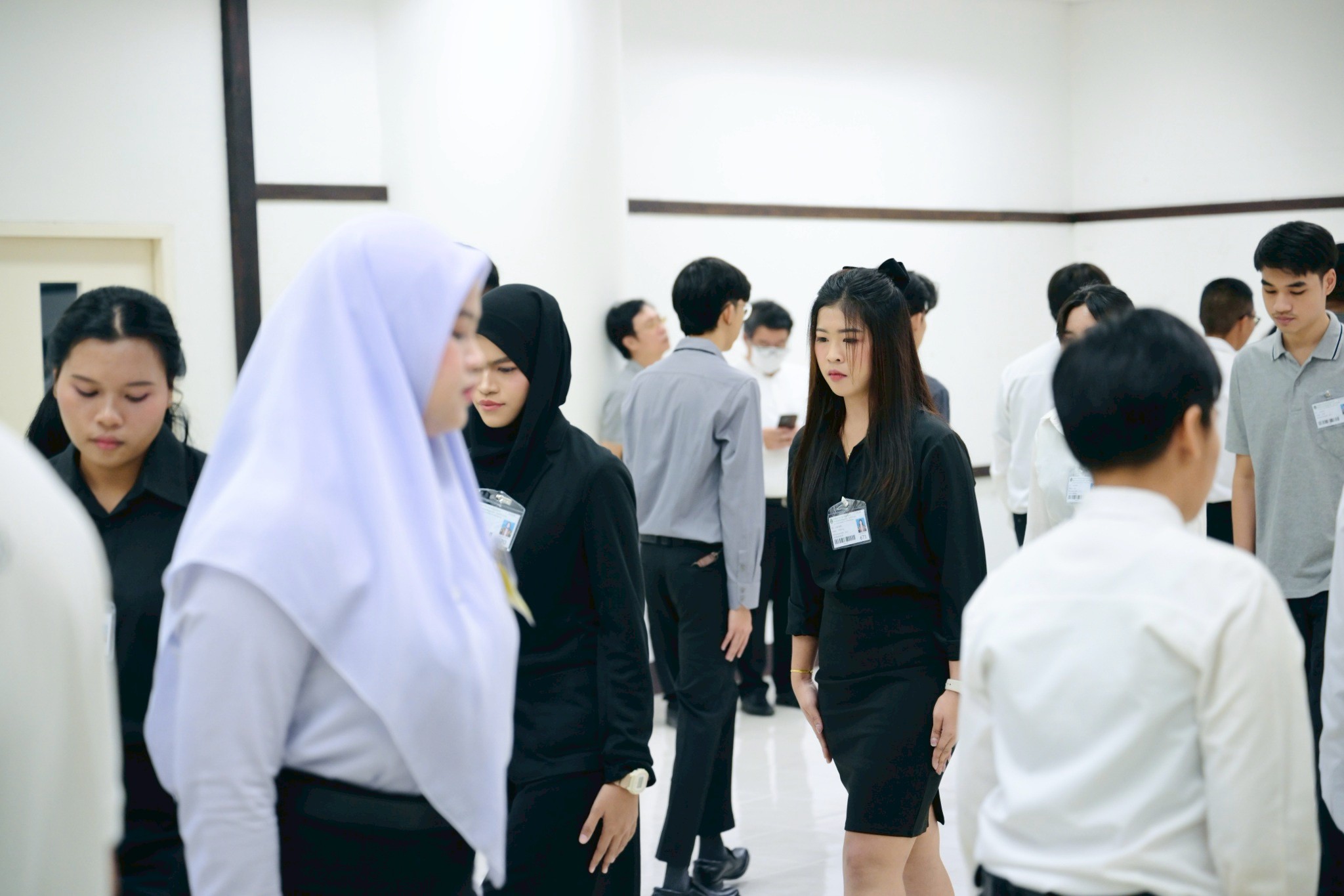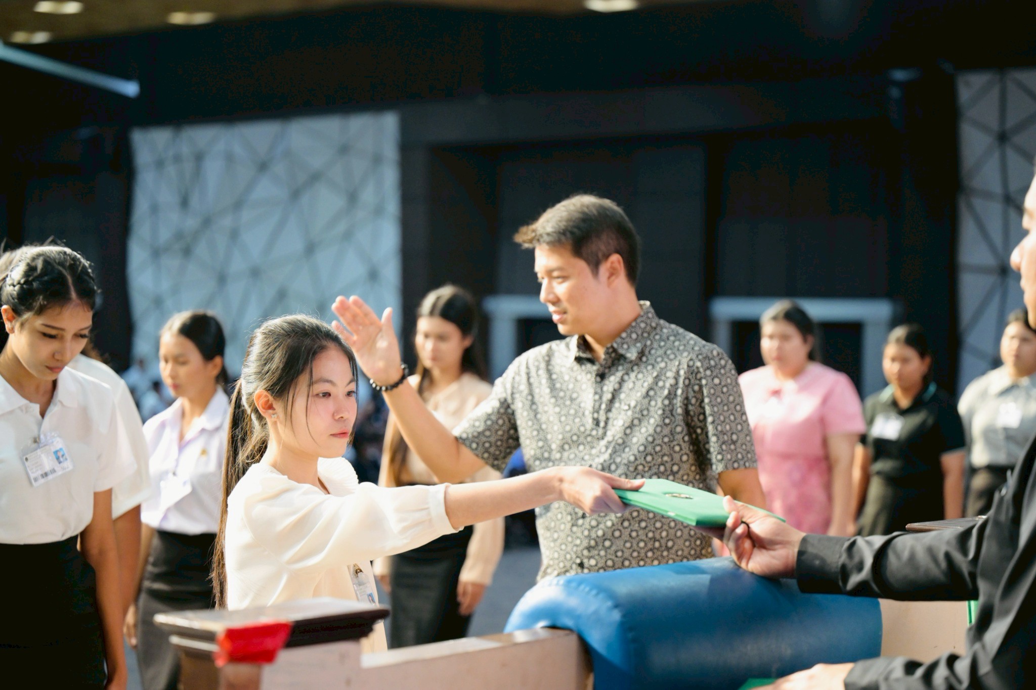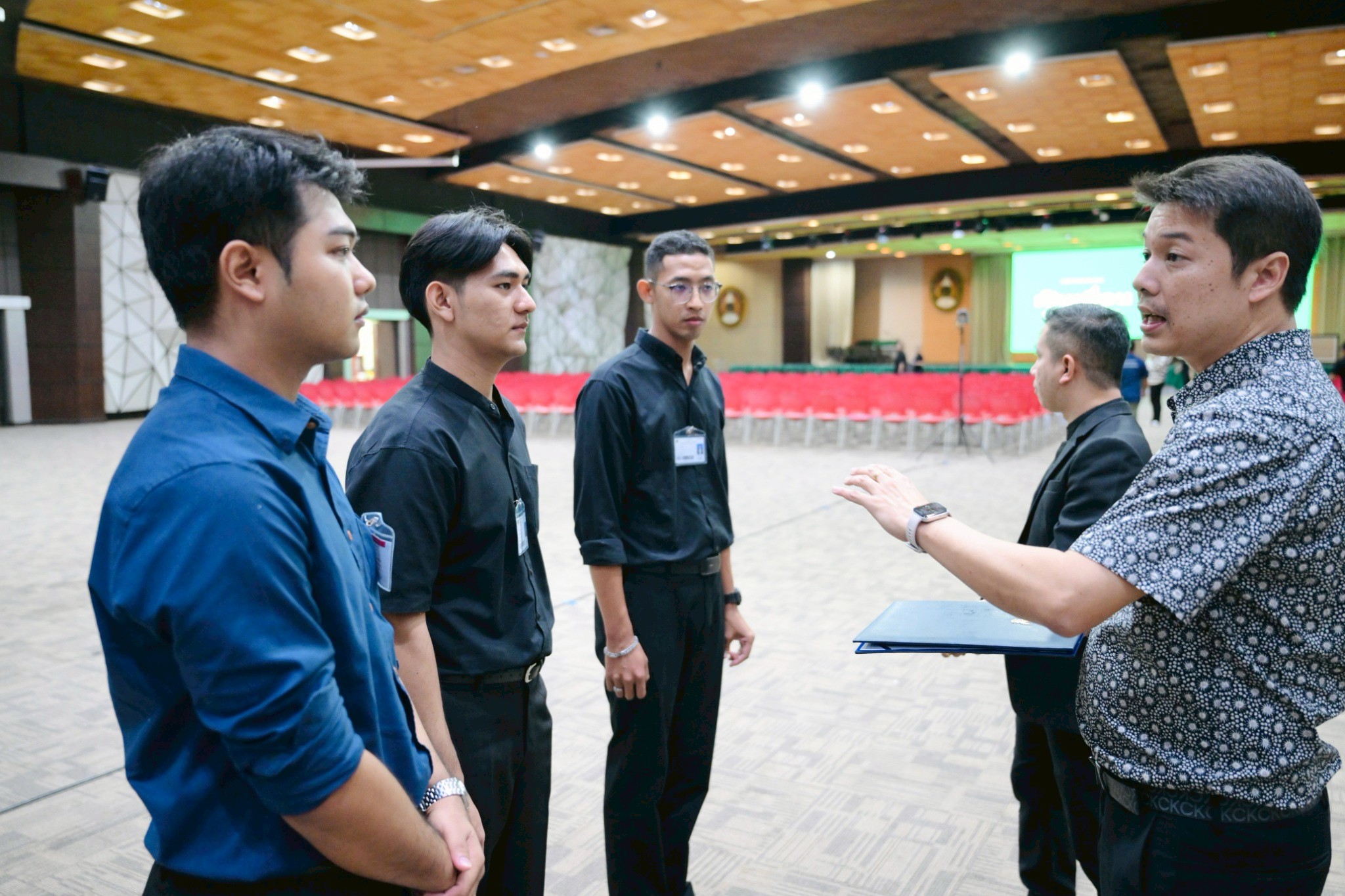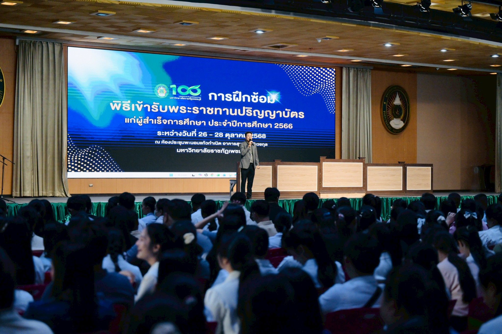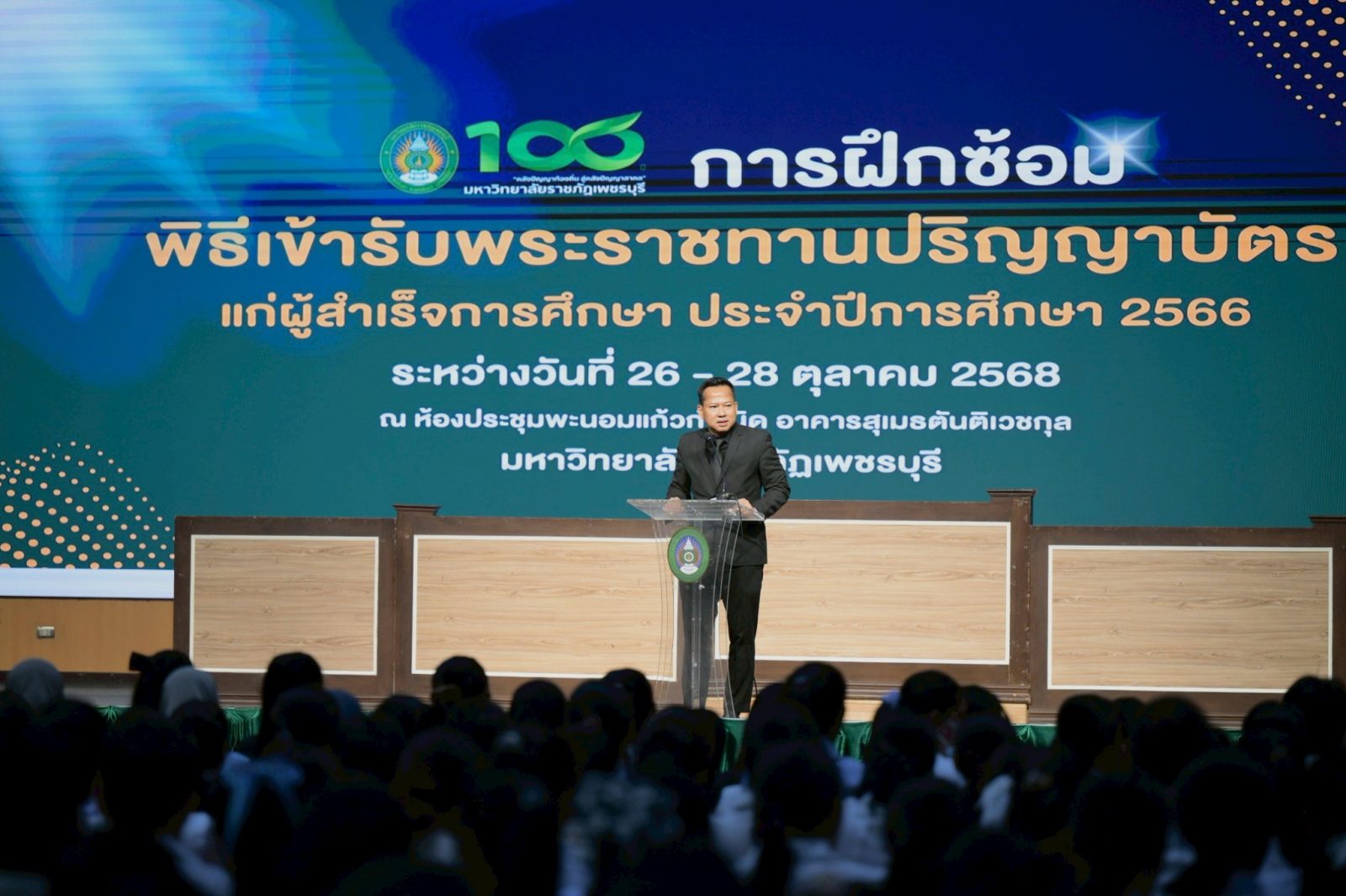 วันที่ 26 ตุลาคม 2568 ณ ห้องประชุมพนอมแก้วกำเนิด อาคารสุเมธตันติเวชกุล มหาวิทยาลัยราชภัฏเพชรบุรี รองศาสตราจารย์ ดร.พัชรศักดิ์ อาลัย รักษาราชการแทนอธิการบดีมหาวิทยาลัยราชภัฏเพชรบุรี กล่าวให้การต้อนรับและแสดงความยินดีแก่บัณฑิตมหาวิทยาลัยราชภัฏเพชรบุรี ในพิธีซ้อมรับพระราชทานปริญญาบัตร ประจำปีการศึกษา 2566 ที่กำหนดจัดขึ้นระหว่างวันที่ 26 – 28 ตุลาคม 2568 โดยมีบัณฑิตจากทุกคณะเข้าร่วมการฝึกซ้อมอย่างพร้อมเพรียง
