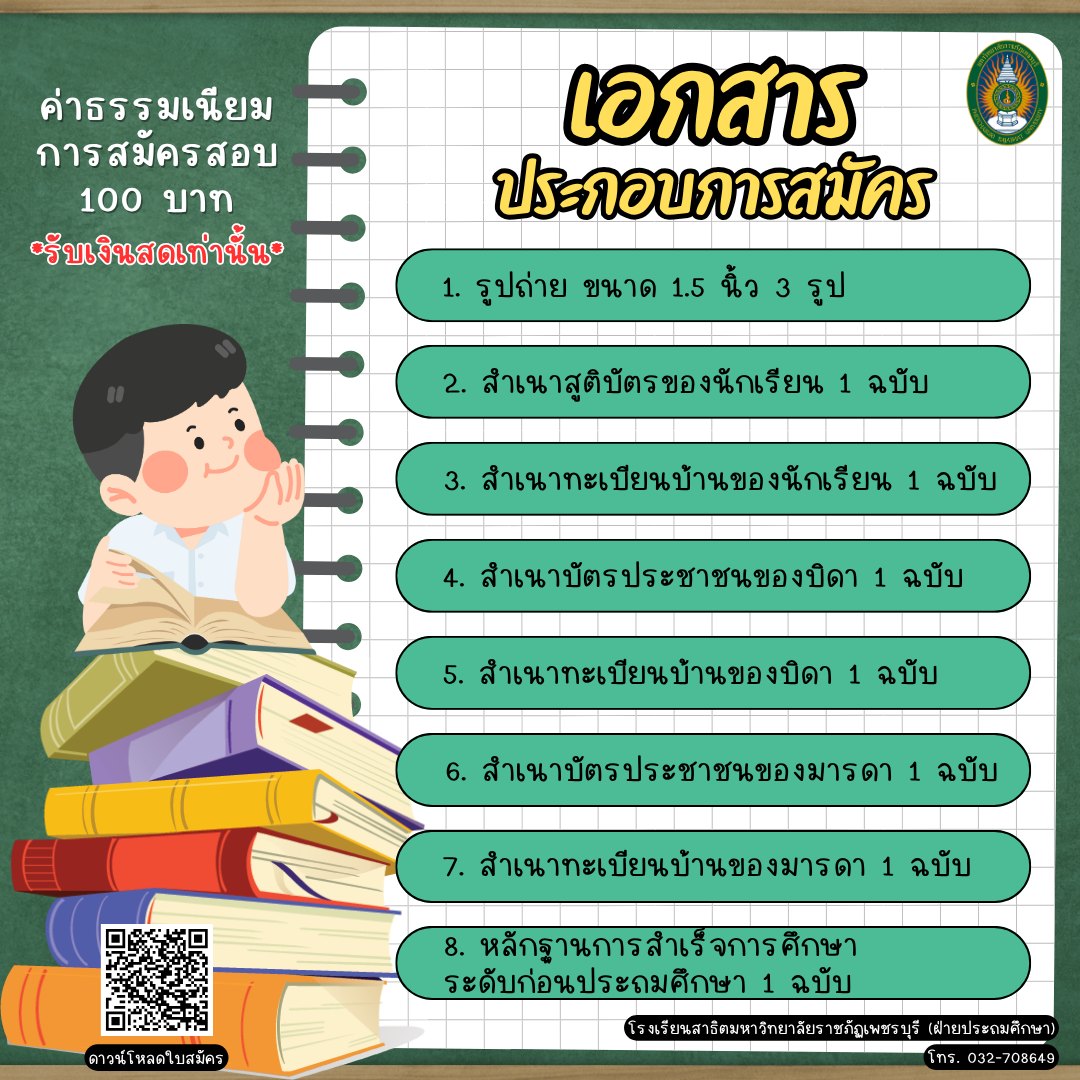กำหนดการรับสมัครนักเรียนโรงเรียนสาธิตมหาวิทยาลัยราชภัฏเพชรบุรี ชั้น ป.1 และ ป.4 ปีการศึกษา 2569 3 พฤศจิกายน 20253 พฤศจิกายน 2025นายพศวีร์ คอนจอหอข่าวประชาสัมพันธ์, ข่าวสำหรับบุคลากร, ข่าวสื่อสารองค์กร จำนวนผู้ชม : 6 กำหนดการรับสมัครนักเรียนโรงเรียนสาธิตมหาวิทยาลัยราชภัฏเพชรบุรี ชั้น ป.1 และ ป.4 ปีการศึกษา 2569 กำหนดการรับสมัครนักเรียนโรงเรียนสาธิตมหาวิทยาลัยราชภัฏเพชรบุรีชั้น ป.1 และ ป.4 ปีการศึกษา 2569รับสมัครตั้งแต่บัดนี้ – 28 พฤศจิกายน นี้สามารถสแกน qr code หรือกดลิงก์เพื่อดาวน์โหลดใบสมัครได้ที่https://drive.google.com/…/190cP3FwJx6LOs7UxoCKGvfkMKRN… Facebook iconFacebookTwitter iconTwitterLINE iconLine