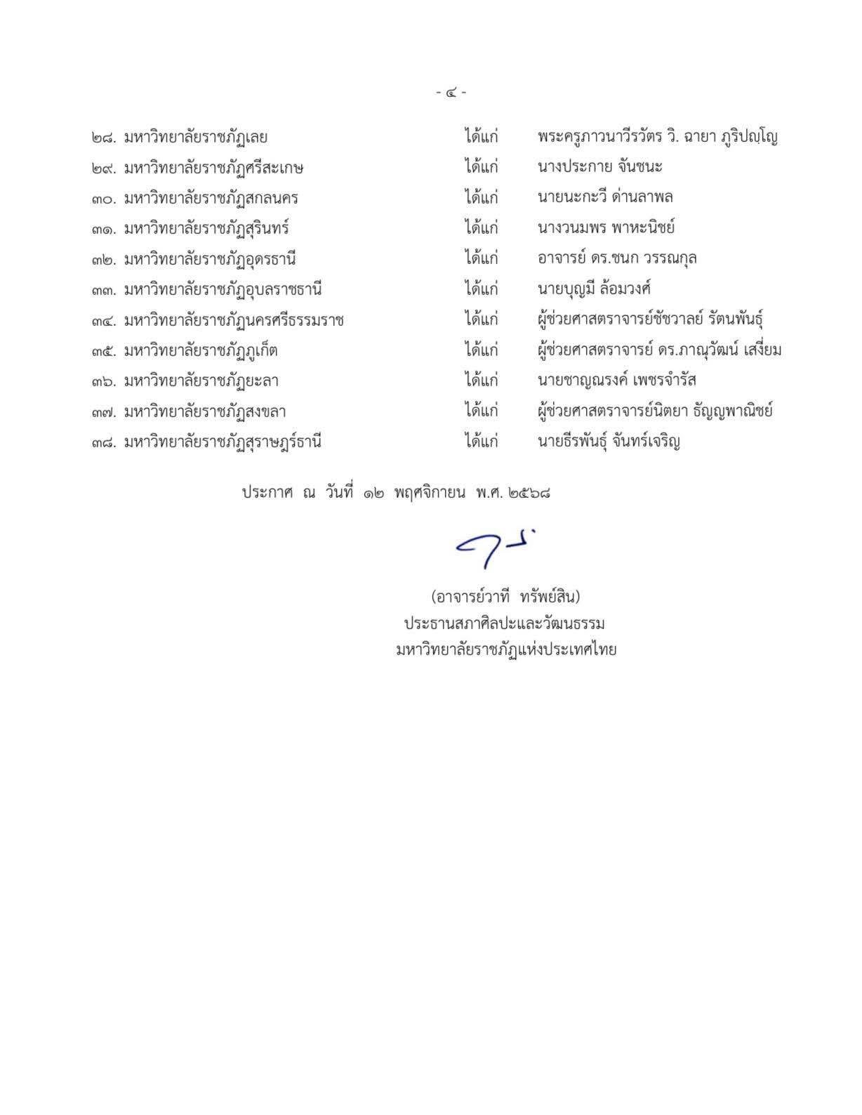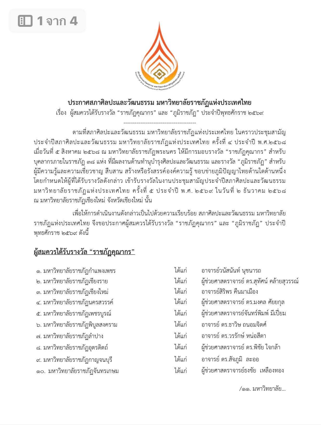 ทั้งนี้ จะมีพิธีมอบรางวัลในงานประชุมสามัญประจำปีสภาศิลปะและวัฒนธรรม มหาวิทยาลัยราชภัฏแห่งประเทศไทย ครั้งที่ 5 ประจำปีพุทธศักราช 2569 ในวันที่ 2 ธันวาคม 2568 ณ มหาวิทยาลัยราชภัฏเชียงใหม่