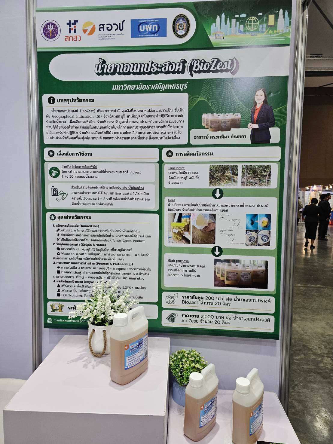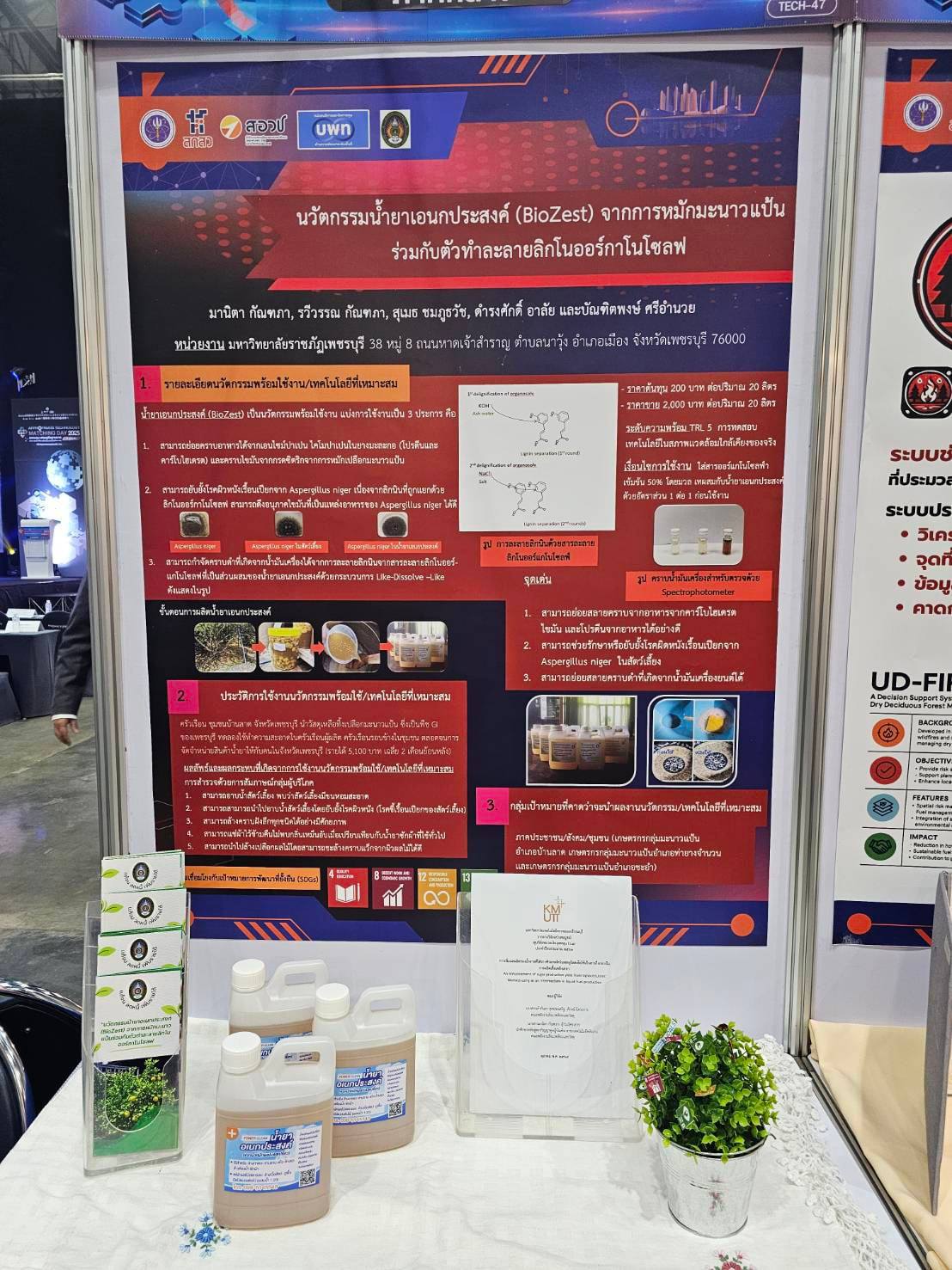 อาจารย์ ดร.มานิตา กัณฑภา ได้นำเสนอผลงานวิจัย เรื่องนวัตกรรมน้ำยาเอนกประสงค์ (BioZest) จากการหมักมะนาวแป้นร่วมกับตัวทำละลายลิกโนออร์กาโนโซลฟ ซึ่งมีจุดเด่นคือสามารถย่อยสลายคราบอาหารจากคาร์โบไฮเดรต ไขมัน เเละโปรตีนได้เป็นอย่างดี สามารถช่วยรักษาหรือยับยั้งโรคผิดหนังเรื้อนเปียกจาก Aspergillus niger ในสัตว์เลี้ยง และสามารถย่อยสลายคราบดำที่เกิดจากน้ำมันเครื่องยนต์ได้