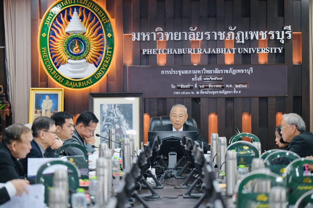 วันที่ 15 ธันวาคม 2568 ณ ห้องประชุมราชภัฏสภา ชั้น 9 อาคารวิทยาภิรมย์ มหาวิทยาลัยราชภัฏเพชรบุรี พลอากาศเอก ชลิต พุกผาสุข นายกสภามหาวิทยาลัยราชภัฏเพชรบุรี เป็นประธานในการประชุมสภามหาวิทยาลัยราชภัฏเพชรบุรี ครั้งที่ 12/2568 โดยมีรองศาสตราจารย์ ดร.พัชรศักดิ์ อาลัย รักษาราชการแทนอธิการบดีมหาวิทยาลัยราชภัฏเพชรบุรี พร้อมด้วยคณะกรรมการสภามหาวิทยาลัย ผู้ทรงคุณวุฒิ คณาจารย์และบุคลากรผู้เกี่ยวข้องเข้าร่วม