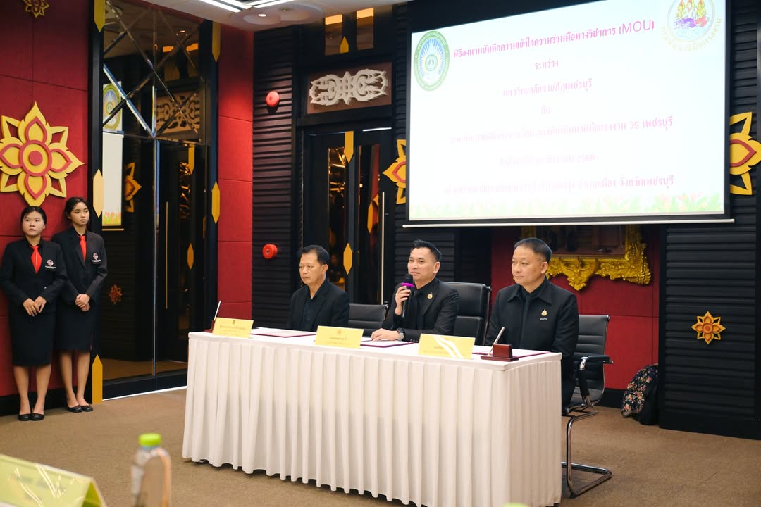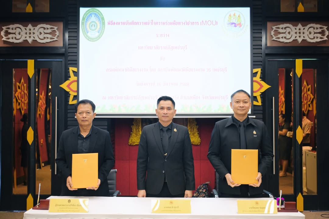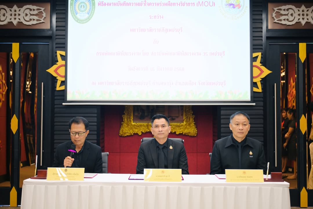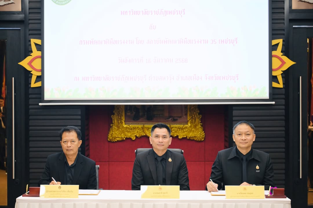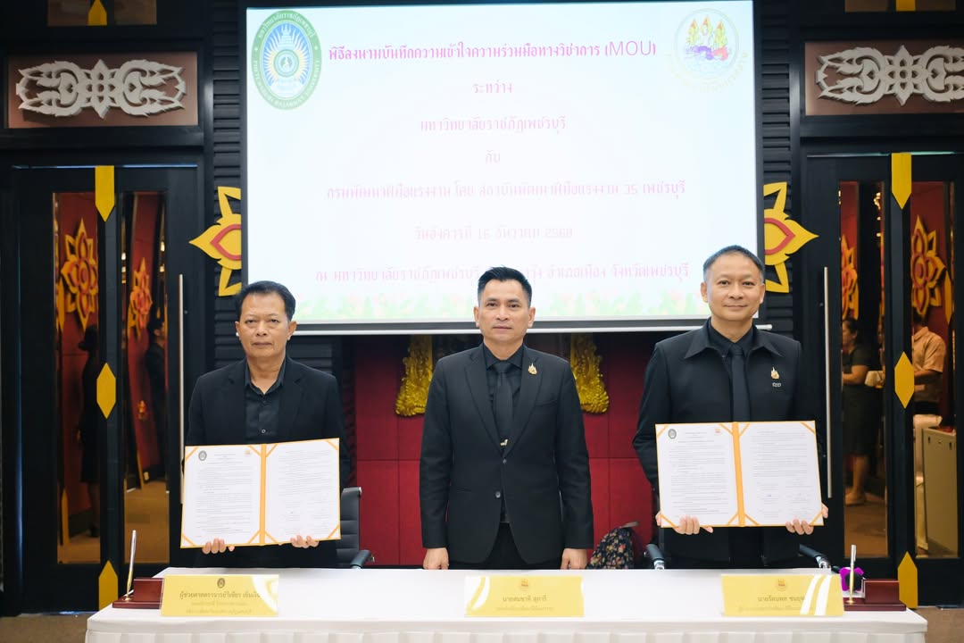 วันที่ 16 ธันวาคม 2568 The PBRU Heritage อาคารปฏิบัติการโรงแรมและท่องเที่ยว มหาวิทยาลัยราชภัฏเพชรบุรี รองศาสตราจารย์ ดร.พัชรศักดิ์ อาลัย รักษาราชการแทนอธิการบดีมหาวิทยาลัยราชภัฏเพชรบุรี มอบหมายให้ผู้ช่วยศาสตราจารย์วิเชียร เข็มเงิน รองอธิการบดีมหาวิทยาลัยราชภัฏเพชรบุรี ให้การต้อนรับและร่วมลงนามบันทึกข้อตกลงความร่วมมือ (MOU) กับสถาบันพัฒนาฝีมือแรงงาน 35 เพชรบุรี โดยนายรัตนพล ชนยุทธ ผู้อำนวยการสถาบันพัฒนาฝีมือแรงงาน 35 เพชรบุรี ซึ่งการลงนามความร่วมมือในครั้งนี้ได้รับเกียรติจากนายสมชาติ สุภารี รองอธิบดีกรมพัฒนาฝีมือแรงาน เป็นสักขีพยานในการประสานความร่วมมือ