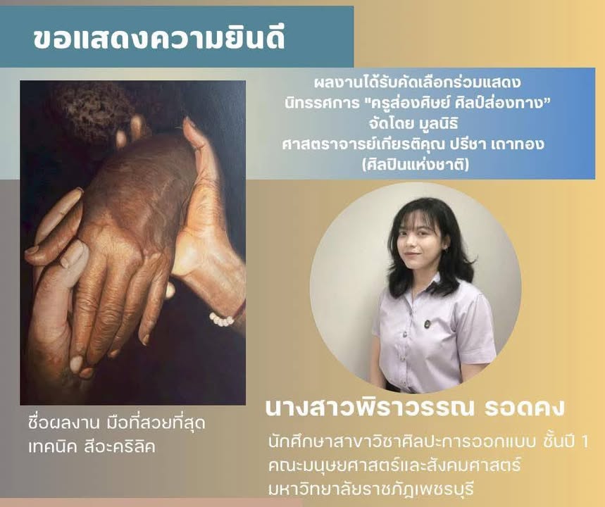 ✨ที่ผลงานได้รับคัดเลือกร่วมแสดง ในนิทรรศการ “ จากครู สู่ลูกศิษย์ ” จัดโดย มูลนิธิศาสตราจารย์เกียรติคุณ ปรีชา เถาทอง ศิลปินแห่งชาติ