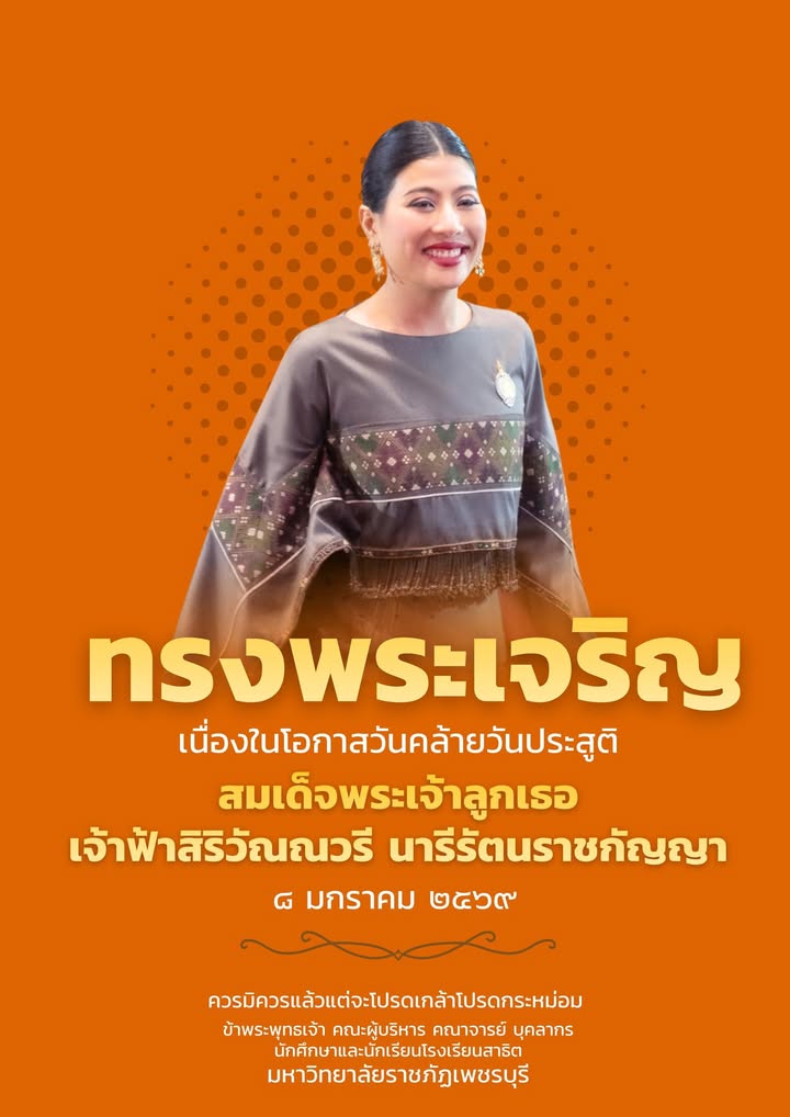 ✨ทรงพระเจริญ✨ เนื่องในโอกาสวันคล้ายวันประสูติ 8 มกราคม 20268 มกราคม 2026no-Systemข่าวสื่อสารองค์กร จำนวนผู้ชม : 4 ✨ทรงพระเจริญ✨เนื่องในโอกาสวันคล้ายวันประสูติสมเด็จพระเจ้าลูกเธอ เจ้าฟ้าสิริวัณณวรี นารีรัตนราชกัญญา๘ มกราคม ๒๕๖๙__________________________ควรมิควรแล้วแต่จะโปรดเกล้าโปรดกระหม่อมข้าพระพุทธเจ้า คณะผู้บริหาร คณาจารย์ บุคลากรนักศึกษาและนักเรียนโรงเรียนสาธิตมหาวิทยาลัยราชภัฏเพชรบุรี Facebook iconFacebookTwitter iconTwitterLINE iconLine