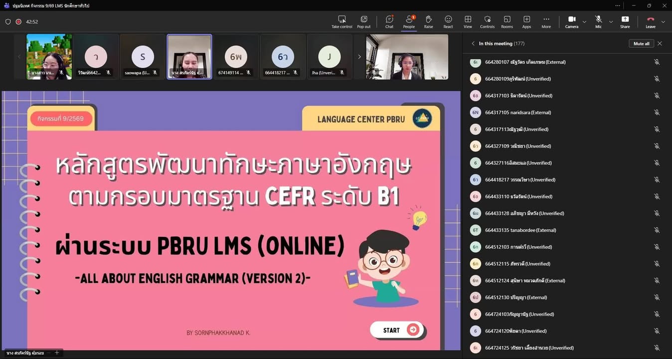 วันที่ 14 มกราคม 2569 ศูนย์ภาษา จัดกิจกรรมปฐมนิเทศ กิจกรรมที่ 9/2569 สำหรับผู้เข้าร่วม “หลักสูตรพัฒนาทักษะภาษาอังกฤษตามกรอบมาตรฐาน CEFR ระดับ B1 ผ่านระบบ PBRU LMS (Online)” เพื่อเตรียมความพร้อมให้แก่ผู้เข้าร่วมหลักสูตรก่อนเริ่มการเรียนการสอน