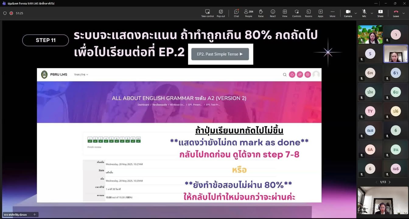 ในการนี้ นางสรภัคร์นัฐ คุ้มรอบ นักวิชาการศึกษา พร้อมด้วยทีมงานศูนย์ภาษา ได้ชี้แจงรายละเอียดของหลักสูตร ทั้งในด้านโครงสร้างการเรียน การจัดกิจกรรมการเรียนรู้ผ่านระบบออนไลน์ แนวทางการประเมินผล รวมถึงขั้นตอนและข้อแนะนำในการใช้งานระบบ PBRU LMS เพื่อให้ผู้เข้าร่วมสามารถเข้าถึงบทเรียนได้อย่างสะดวกและเกิดประสิทธิภาพสูงสุด