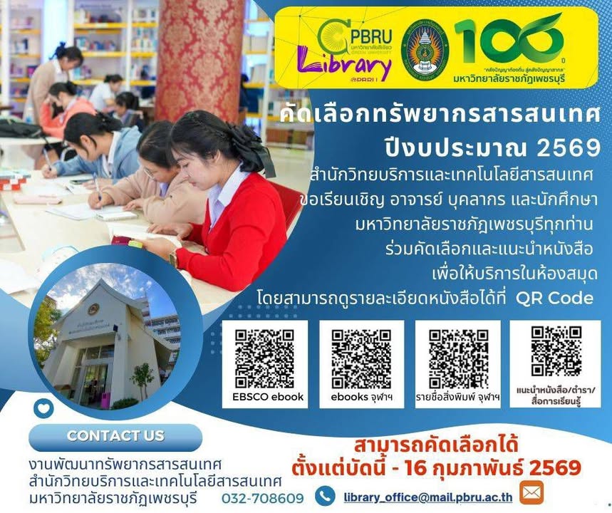 📣 สำนักวิทยบริการและเทคโนโลยีสารสนเทศ ขอเชิญ อาจารย์ บุคลากร และนักศึกษามหาวิทยาลัยราชภัฎเพชรบุรีทุกท่าน ร่วมเสนอและคัดเลือกหนังสือ เพื่อให้บริการในห้องสมุด สามารถดูรายละเอียดหนังสือ