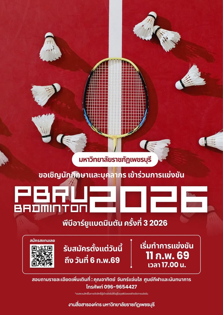 มหาวิทยาลัยราชภัฏเพชรบุรี เชิญชวนนักศึกษาและบุคลากร ร่วมแข่งขัน “PBRU BADMINTON 2026” ครั้งที่ 3 4 กุมภาพันธ์ 20264 กุมภาพันธ์ 2026no-Systemข่าวสื่อสารองค์กร จำนวนผู้ชม : 2 🏸นักแบด PBRU💚💛สนใจไปหวดลูกขนไก่กันมั้ยยยยรีบสมัครน้าาาา ใกล้หมดเขตแล้ว🌈✨🏸 Facebook iconFacebookTwitter iconTwitterLINE iconLine