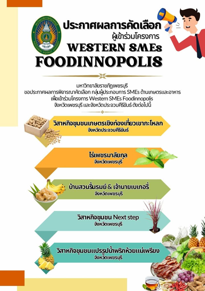 🎉🎉🎉 มหาวิทยาลัยราชภัฏเพชรบุรี ประกาศผลคัดเลือกกลุ่ม SMEs ด้านเกษตรและอาหารสุดแกร่ง 5 ราย เข้าร่วมโครงการ Western SMEs Foodinnopolis เตรียมยกระดับธุรกิจสู่ความสำเร็จ