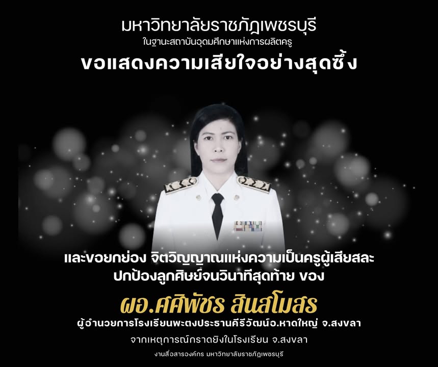 มหาวิทยาลัยราชภัฏเพชรบุรี ในฐานะสถาบันอุดมศึกษาแห่งการผลิตครู 12 กุมภาพันธ์ 202612 กุมภาพันธ์ 2026no-Systemข่าวสื่อสารองค์กร จำนวนผู้ชม : 1 มหาวิทยาลัยราชภัฏเพชรบุรีในฐานะสถาบันอุดมศึกษาแห่งการผลิตครูขอแสดงความเสียใจอย่างสุดซึ้งและขอยกย่อง จิตวิญญาณแห่งความเป็นครูผู้เสียสละปกป้องลูกศิษย์จนวินาทีสุดท้ายของ ผอ.ศศิพัชร สินสโมสรผู้อำนวยการโรงเรียนพะตงประธานคีรีวัฒน์อ.หาดใหญ่ จ.สงขลาจากเหตุการณ์กราดยิงในโรงเรียน จ.สงขลา Facebook iconFacebookTwitter iconTwitterLINE iconLine