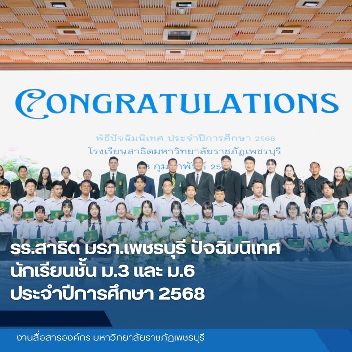 วันที่ 18 กุมภาพันธ์ 2569 ณ ห้องประชุมพะนอมแก้วกำเนิด อาคารสุเมธตันติเวชกุล มหาวิทยาลัยราชภัฏเพชรบุรี รองศาสตราจารย์ ดร.พัชรศักดิ์ อาลัย อธิการบดีมหาวิทยาลัยราชภัฏเพชรบุรี เป็นประธานในพิธีกล่าวแสดงความยินดี ให้โอวาท และมอบเกียรติบัตรแก่นักเรียนระดับชั้นมัธยมศึกษาปีที่ 3 และมัธยมศึกษาปีที่ 6 โรงเรียนสาธิตมหาวิทยาลัยราชภัฏเพชรบุรี ที่สำเร็จการศึกษา ประจำปีการศึกษา 2568 โดยมีคณะผู้บริหารมหาวิทยาลัย ผู้บริหาร คณะครู และบุคลากรของโรงเรียนสาธิตฯ เข้าร่วมแสดงความยินดีในกิจกรรมปัจฉิมนิเทศ ประจำปีการศึกษา 2568