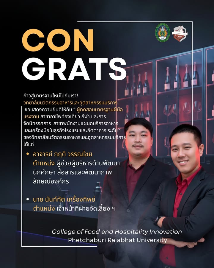 คณาจารย์และบุคลากรวิทยาลัยนวัตกรรมอาหารและอุตสาหกรรมบริการ ที่ได้รับการรับรองเป็นผู้ทดสอบมาตรฐานฝีมือแรงงาน สาขาอาชีพท่องเที่ยว กีฬา และการจัดนิทรรศการสาขาพนักงานแผนกบริการอาหารและเครื่องดื่มในธุรกิจโรงแรมและภัตตาคาร ระดับ 1 🏅✨