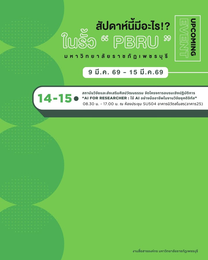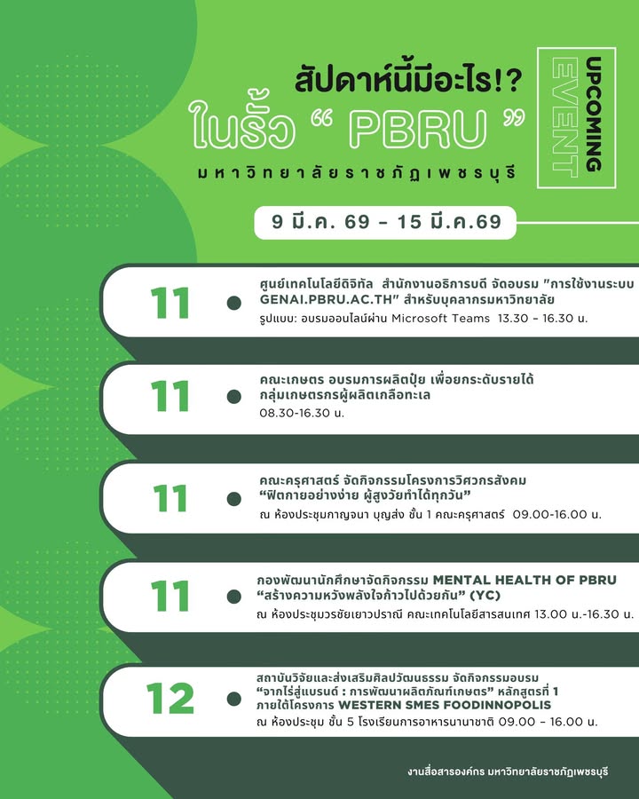 UPCOMING EVENT สัปดาห์นี้มีอะไร!? ในรั้ว “ PBRU ” มหาวิทยาลัยราชภัฏเพชรบุรี 9 มี.ค. 69 – 15 มี.ค.69 9 มีนาคม 20269 มีนาคม 2026no-Systemข่าวสื่อสารองค์กร จำนวนผู้ชม : 1 🥰มาแล้วววว กิจกรรม ประจำสัปดาห์ในรั้ว PBRU 💚💛🗓สัปดาห์นี้ มีกิจกรรมอะไร จากหน่วยงานไหนกันบ้างไปดูกันนนนนน++++📌ปล.ก่อนร่วมกิจกรรมใด ก็ศึกษาข้อมูลกิจกรรมด้วยน้าบางกิจกรรมเป็นแบบออนไลน์ บางกิจกรรมเป็นแบบปิดบางกิจกรรม ก็ต้องลงทะเบียนก่อนน้าาาาสามารถติดต่อไปยังผู้จัดกิจกรรมนั้นๆ ได้เลย🥰 Facebook iconFacebookTwitter iconTwitterLINE iconLine
